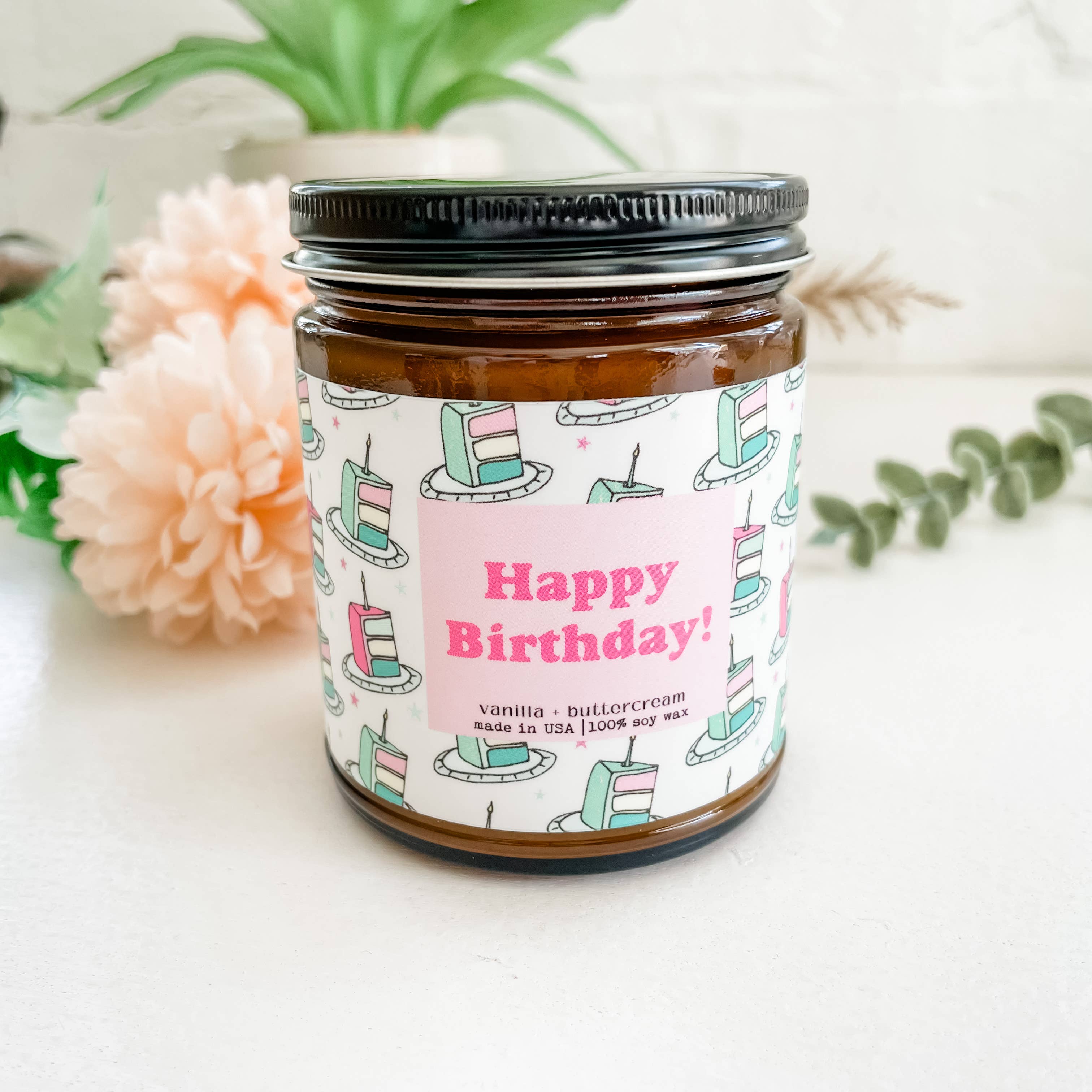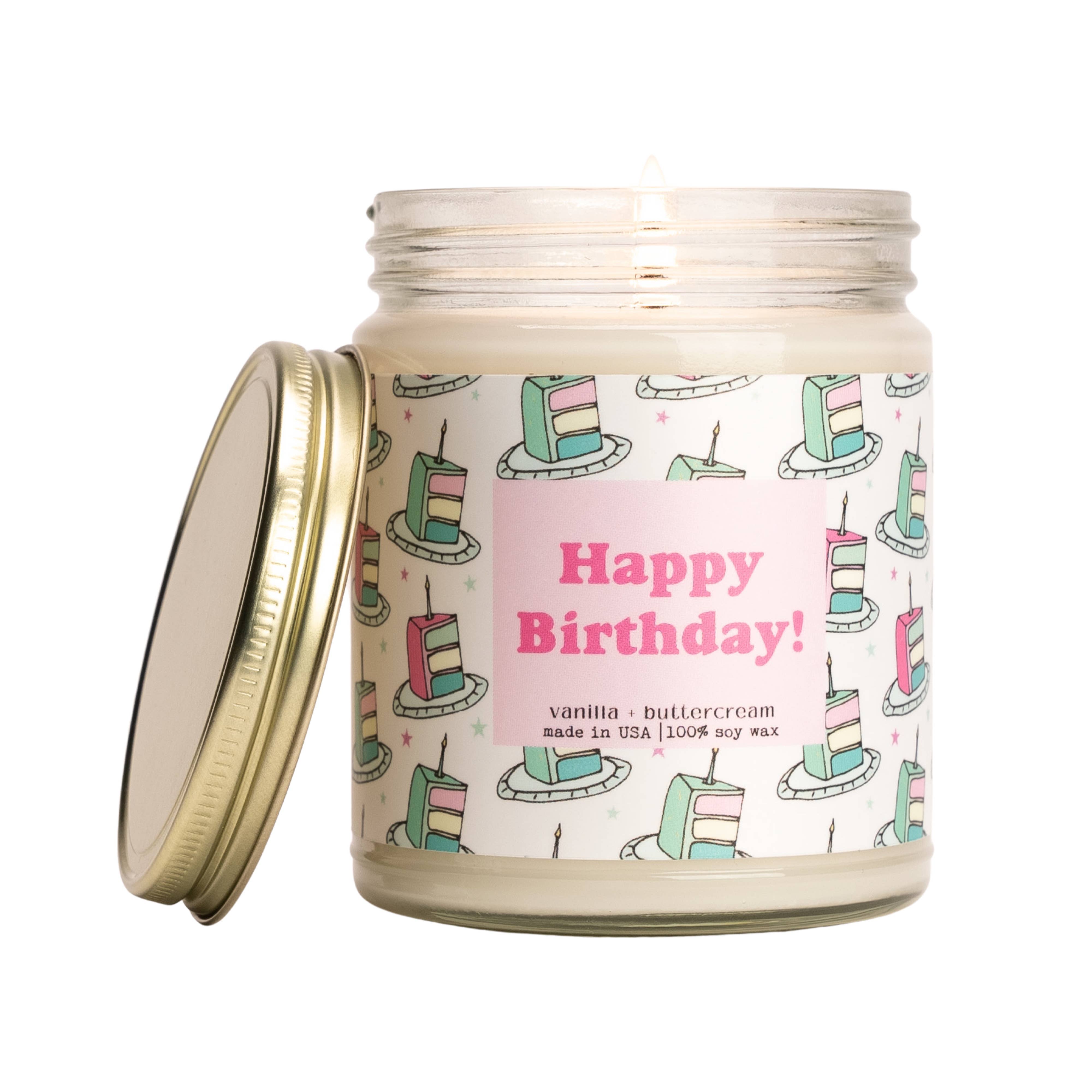 homeware, gift for her, for him, natural candle, non-toxic, home decor, clean burn, vanilla bean, birthday cake, vanilla candle, pretty candle, hand illustrated, hand poured, small batch, delicious, aromatic, cute candle, happy birthday, birthday cake, bday gift, bday candle, cake candle, cute