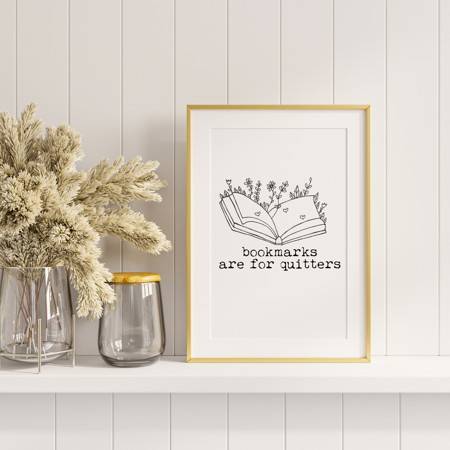 bookmarks are for quitters wall art, open book floral illustration print, book lover home decor, funny book pun artwork, reading nook wall print, library art for bookworms, literary wall decor, book club gift, gift shop reading print, gift for book lover, gift for reader, reading obsessed, book shop merch, book accessories, reading decor, birthday gift, book club, bookish, booktok, romantasy lover, romantasy decor