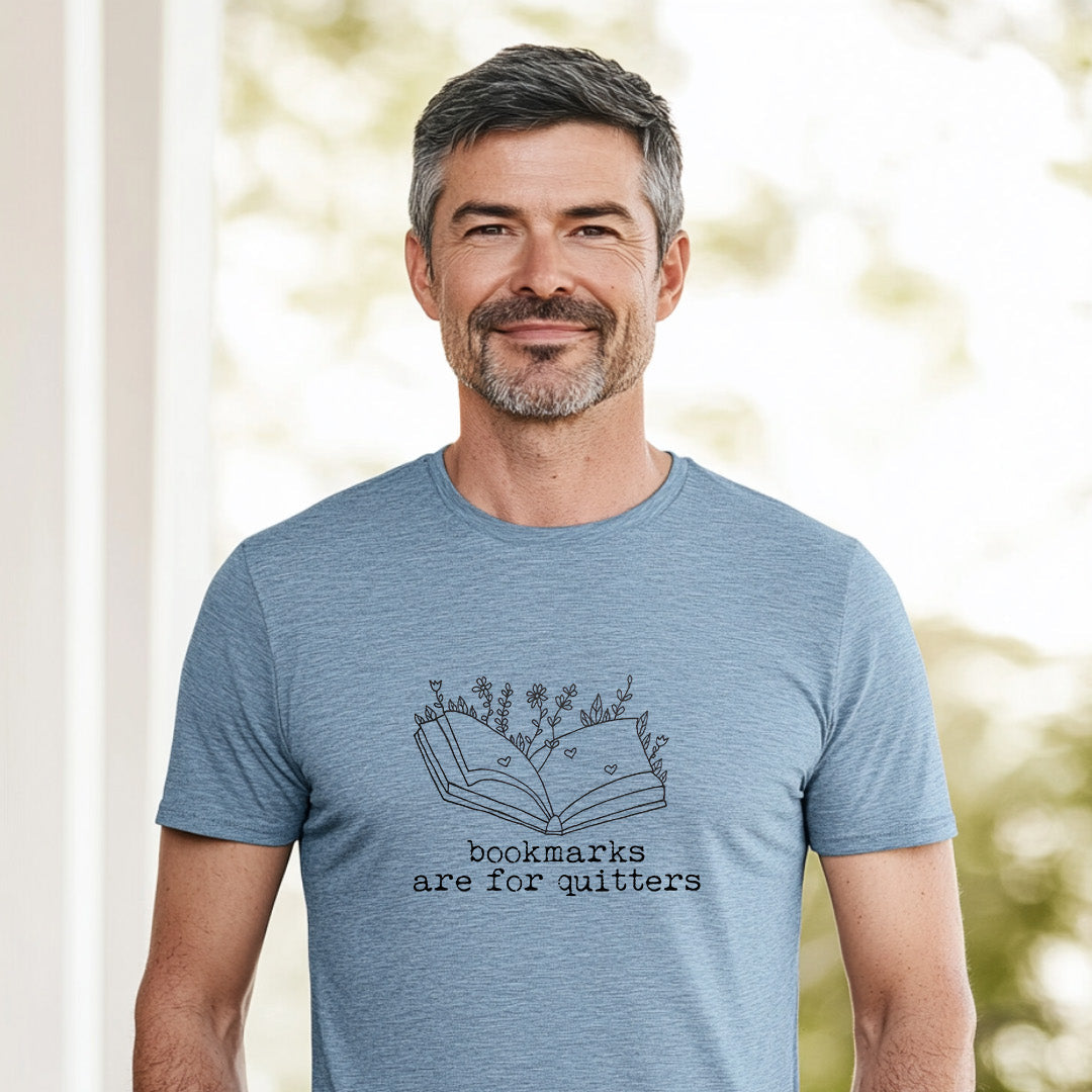 adult, handmade, man, mens, guy, dude, apparel, loose, relax, relaxed, comfy, casual, unisex, lighthearted, humor, humorous, joke, fun, happy, tops, gift, gifts, tshirt, men, him, soft, screenprinted, screen, printed, bookmarks are for quitters men’s t-shirt, book lover graphic tee, open book with flowers shirt, funny book pun men’s apparel, literary casual shirt, bookworm gift clothing, book club t-shirt, gift shop reading tee, gift for book lover, gift for reader, reading obsessed, book shop merch, book accessories, reading apparel, birthday gift, book club, bookish, booktok, romantasy lover, romantasy apparel