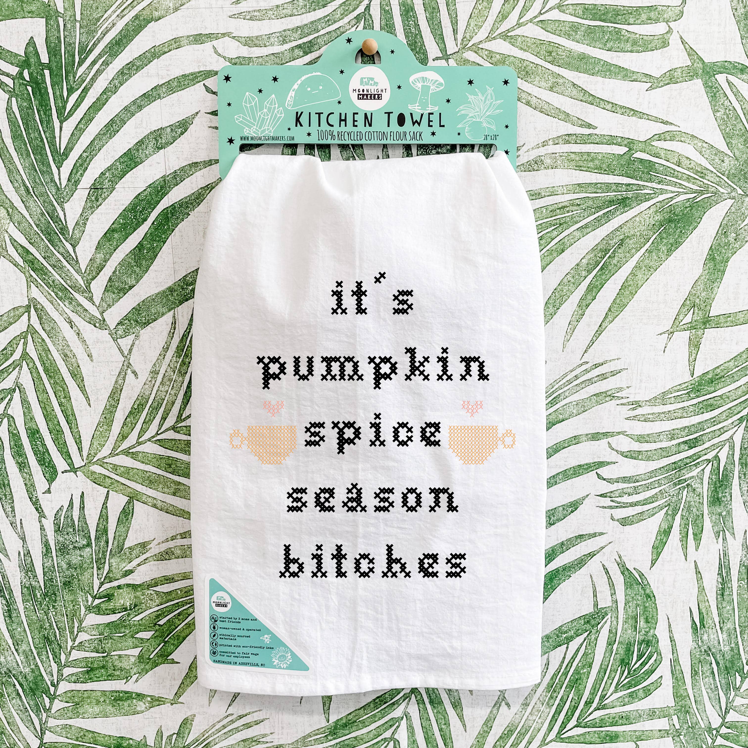 lighthearted, humor, joke, fun, laughter, idea, bar, dishes, gifts, him, her, host, hosting, hostess, handtowel, humorous, snarky dish towel, pumpkin spice, kitchen decor, eco friendly, tea towel, cross stitch, funny fall decor, fall decor, adult humor, fall tea towel, mom humor, pumpkins