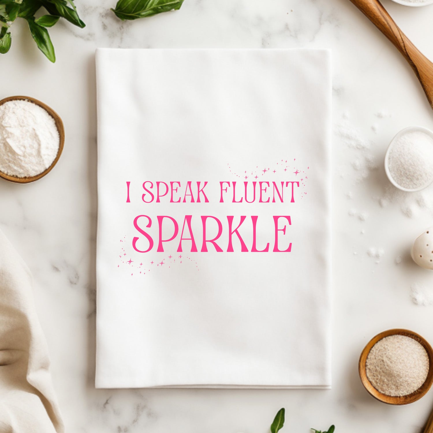 upcycled, sustainable, ecofriendly, I Speak Fluent Sparkle kitchen towel, wicked home decor, wicked inspired towel, sparkle quote towel, aesthetic dish towel, boutique kitchen gift, witchy kitchen accessory, cottagecore home item, gift for her, gift for him, birthday gift, gift for bestie, stocking stuffer, pastel sparkle towel, wicked merch home product, small shop kitchen decor, glitter inspired towel, trendy boutique kitchen accessory, wicked movie themed design, unique retail kitchen towel, magical sparkle kitchen accent