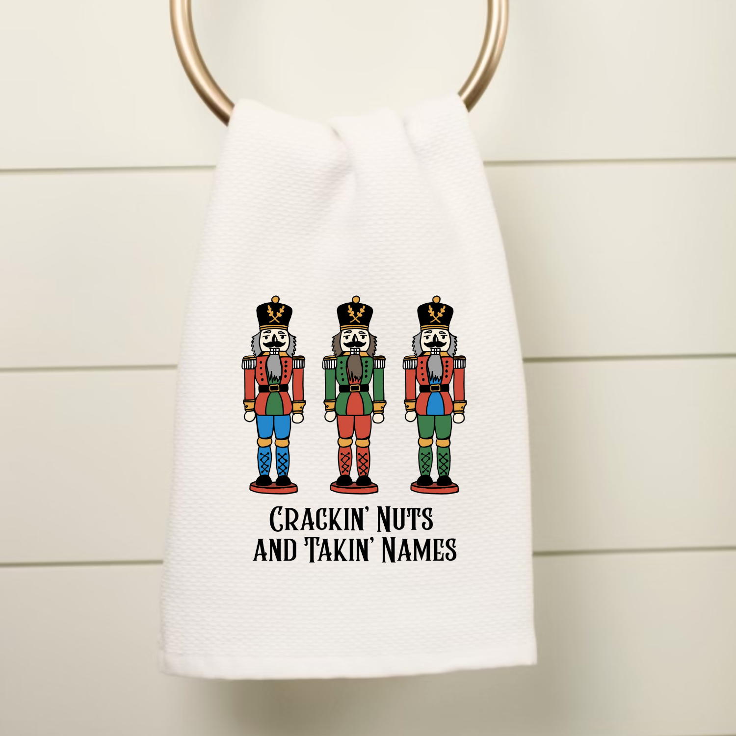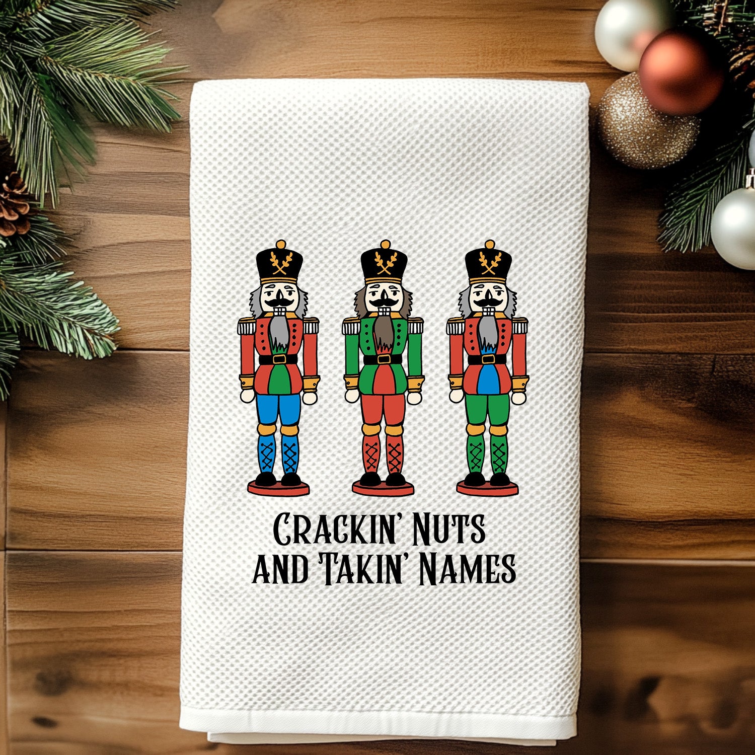 funny holiday hand towel, crackin nuts and takin names waffle towel, nutcracker humor christmas towel, witty holiday waffle weave towel, boutique funny christmas kitchen accessory, cheeky holiday cotton hand towel, gag gift holiday dish towel, quirky nutcracker festive towel, humorous kitchen holiday decor, funny boutique hostess gift towel, farmhouse holiday waffle hand towel, witty nutcracker design holiday towel, playful christmas kitchen decor, novelty holiday baking towel gift, boutique funny holiday hand towel