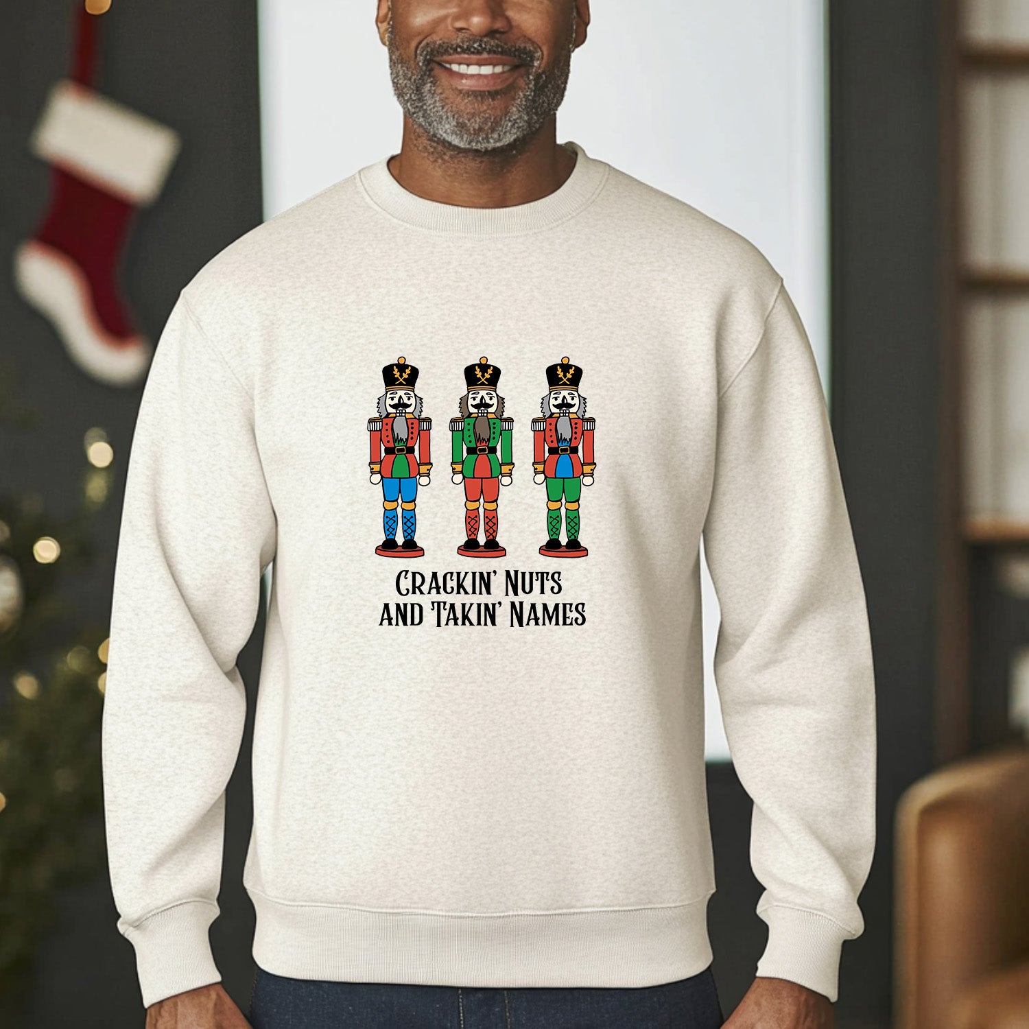Keywords: vintage christmas apparel, cozy christmas apparel, cute holiday clothes, christmas outfit, christmas party outfit, xmas apparel, holiday apparel, funny christmas sweatshirt, crackin nuts and takin names sweater, nutcracker humor holiday sweatshirt, witty festive christmas pullover, quirky christmas boutique sweatshirt, gag gift holiday sweater, oatmeal neutral funny holiday pullover, cheeky nutcracker design sweatshirt, humorous christmas party sweater, full color hand drawn nutcracker sweatshirt, novelty holiday graphic sweatshirt, witty holiday gag gift sweater, funny seasonal christmas sweatshirt, boutique humorous holiday pullover