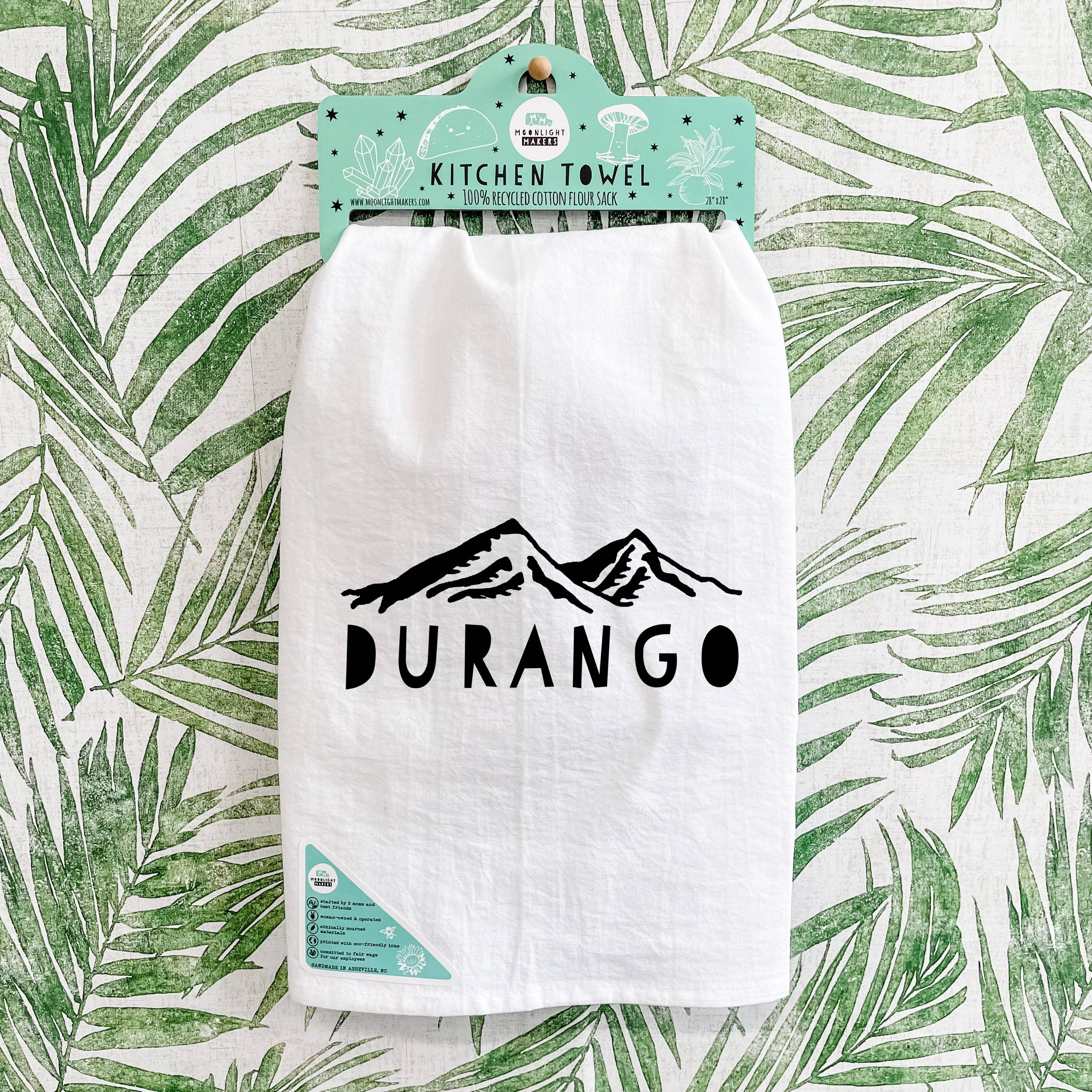 All of our dish towels are 100% cotton flour sack towels, screen printed with Moonlight Makers original designs using non-toxic ink.