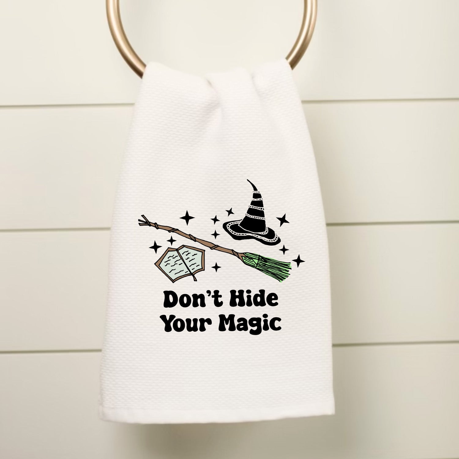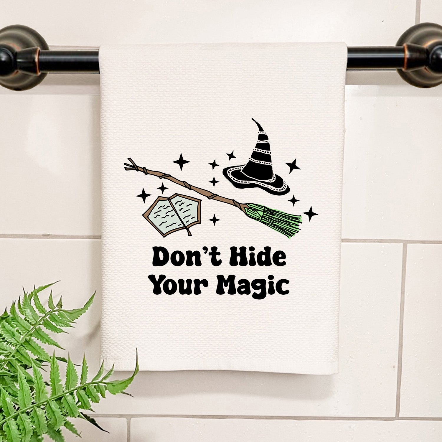 Don’t Hide Your Magic towel, wicked inspired home decor, wicked merch, waffle weave cotton towel, broom and hat design, sparkly witchy towel, pink and green aesthetic towel, witchy bathroom accessory, boutique home towel, magical bath towel, cottagecore bathroom item, boutique bathroom gift, small shop home essential, wicked movie inspired towel, retail ready home towel, aesthetic bathroom piece, wicked themed towel, fandom home merch, magical pastel and green towel, boutique bath item, sparkly bathroom accessory, witchcore home item, trending small shop product, gift for her, gift for him, birthday gift, gift for bestie, stocking stuffer, whimsical broom and hat towel, boutique home essential, sparkly Wicked towel, magical quote towel
