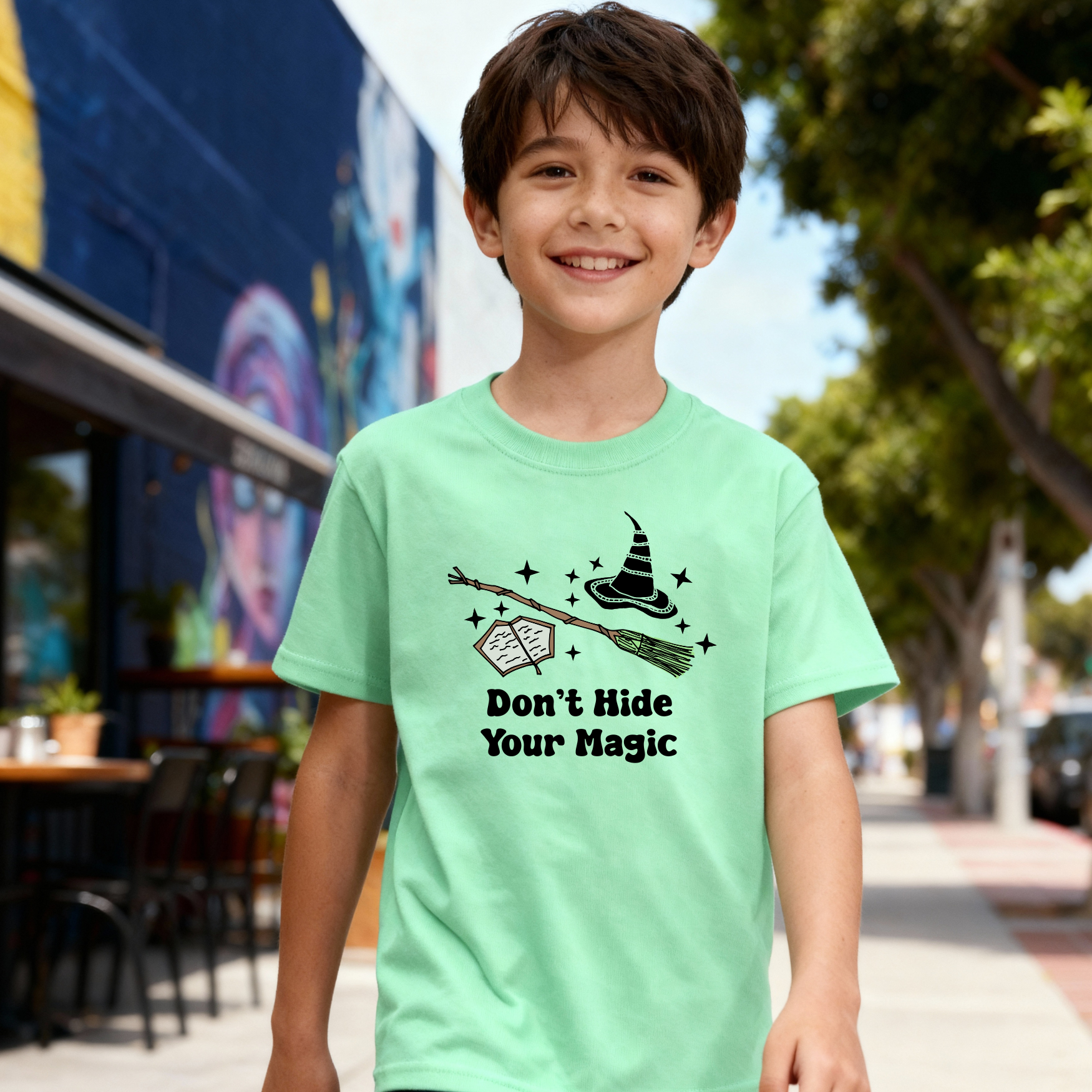 Don’t Hide Your Magic kids tee, wicked kids apparel, wicked inspired shirt, wicked merch, broom and hat design kids tee, sparkly witchy kids shirt, pink and green aesthetic top, witchy design for kids, magical pop culture top, boutique children’s clothing, comfy cotton tee, fandom inspired design, boutique kids bestseller, retail ready kids tee, gift for her, gift for him, birthday gift, gift for bestie, stocking stuffer, wicked movie 2 kids tee, small shop bestseller, witchcore kids fashion, pastel aesthetic tee, sparkly kids t-shirt, magical pop culture kids tee, boutique retail ready shirt, whimsical broom and hat kids tee, trending wicked design, cottagecore kids tee, sparkly boutique apparel