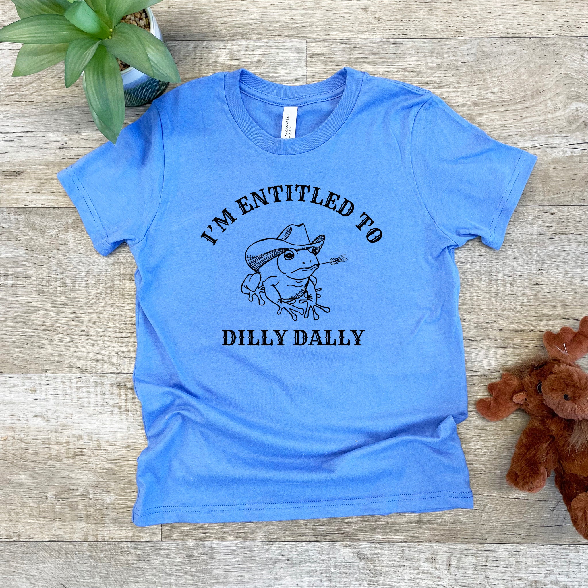 handmade, boy, apparel, loose, relaxed, comfy, casual, soft, unisex, lighthearted, humor, humorous, joke, fun, happy, screenprinted, screen, printed, gifts, tops, gift, tshirt, graphic, funny, I’m Entitled to Dilly Dally kids tee, western frog graphic shirt, frog shirt for children, animal apparel, funny ranch animal tee for kids, first of all I’m a delight, boutique ready kids top, gift for her, gift for him, birthday gift, gift for kids, kids stocking stuffer, trendy pop culture kids shirt, kids frog shirt, kids frog tee, farmhouse aesthetic kids top, funny animal graphic tee, viral tees, meme shirt, whimsical frog design, quirky gift idea, western animal graphic, playful frog quote, kids shirts, western graphic kids tee, playful farmhouse apparel, trending animal quote shirt
