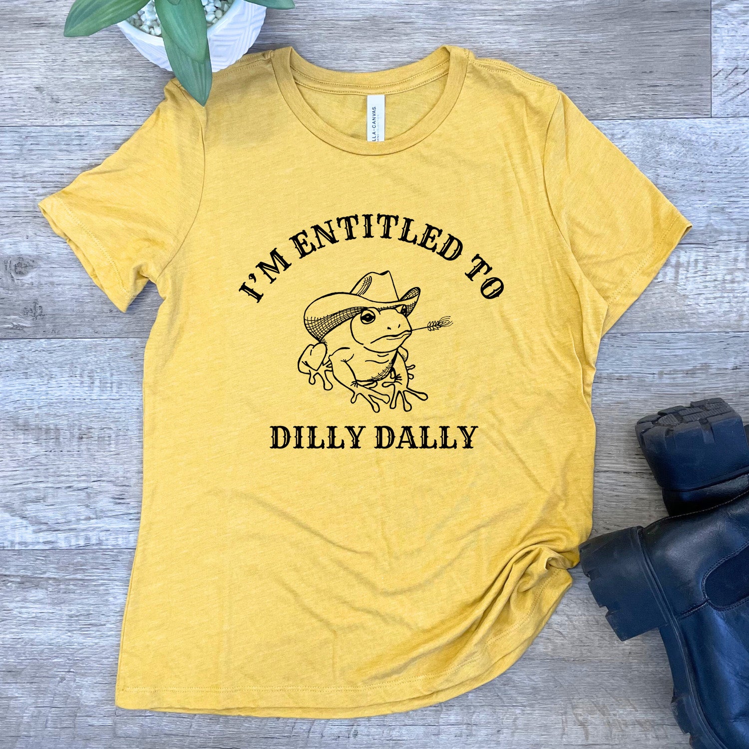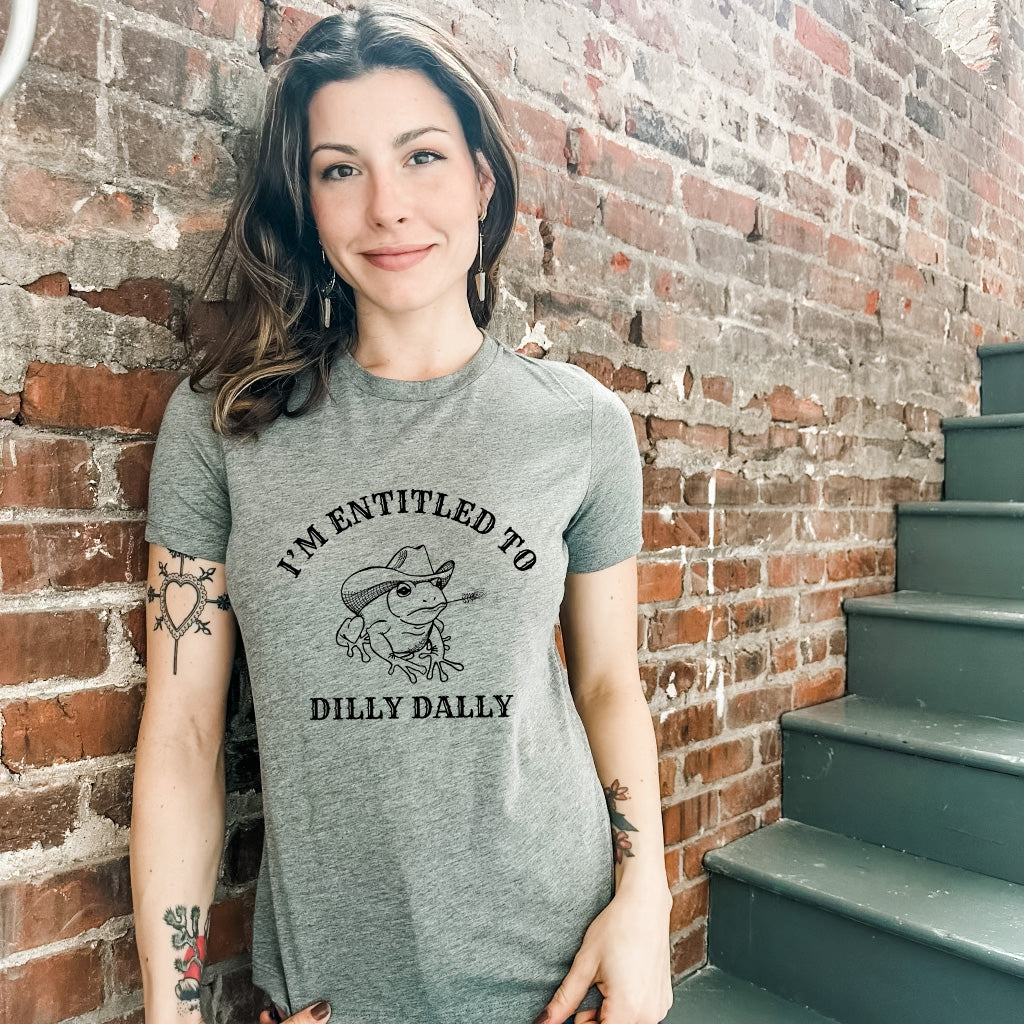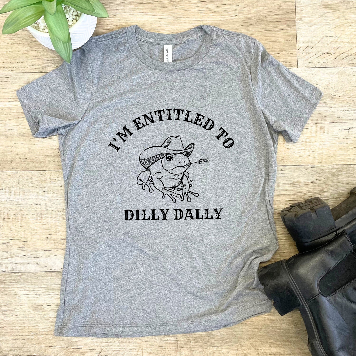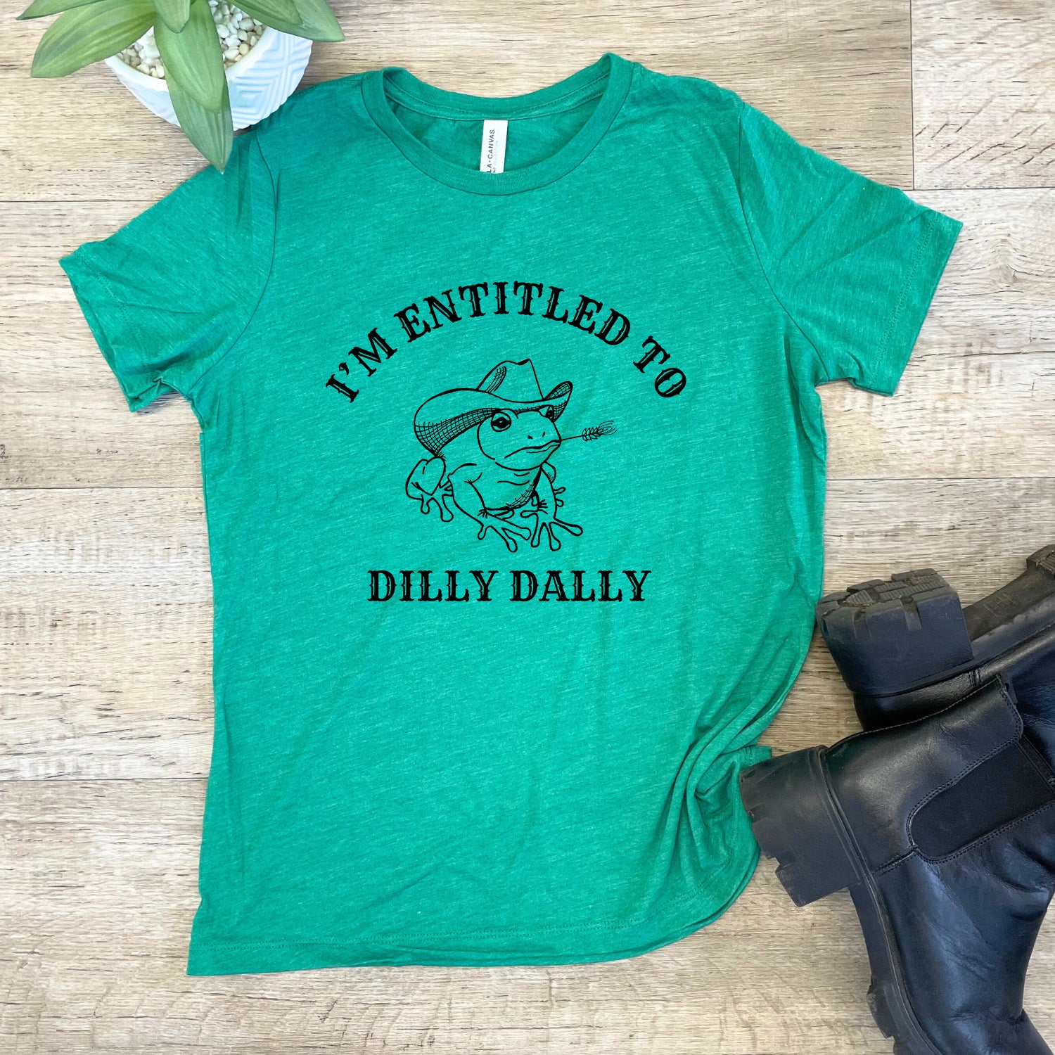 adult, handmade, womens, ladies, apparel, relax, relaxed, comfy, casual, lighthearted, humor, humorous, joke, fun, happy, screenprinted, tshirt, gifts, everyday, I’m Entitled to Dilly Dally women’s crew tee, western frog graphic shirt, cowboy hat frog design, funny animal apparel, funny animal tee, first of all I’m a delight, viral tee, gift for her, birthday gift, gift for bestie, stocking stuffer, trendy pop culture tee, cottagecore, frog fashion, frog lover, frog shirt, farmhouse aesthetic shirt, funny animal graphic tee, whimsical frog design, quirky gift idea, western animal graphic, playful frog quote, boutique fashion essential, western graphic tee, trending animal quote shirt, playful apparel, meme, trending tees