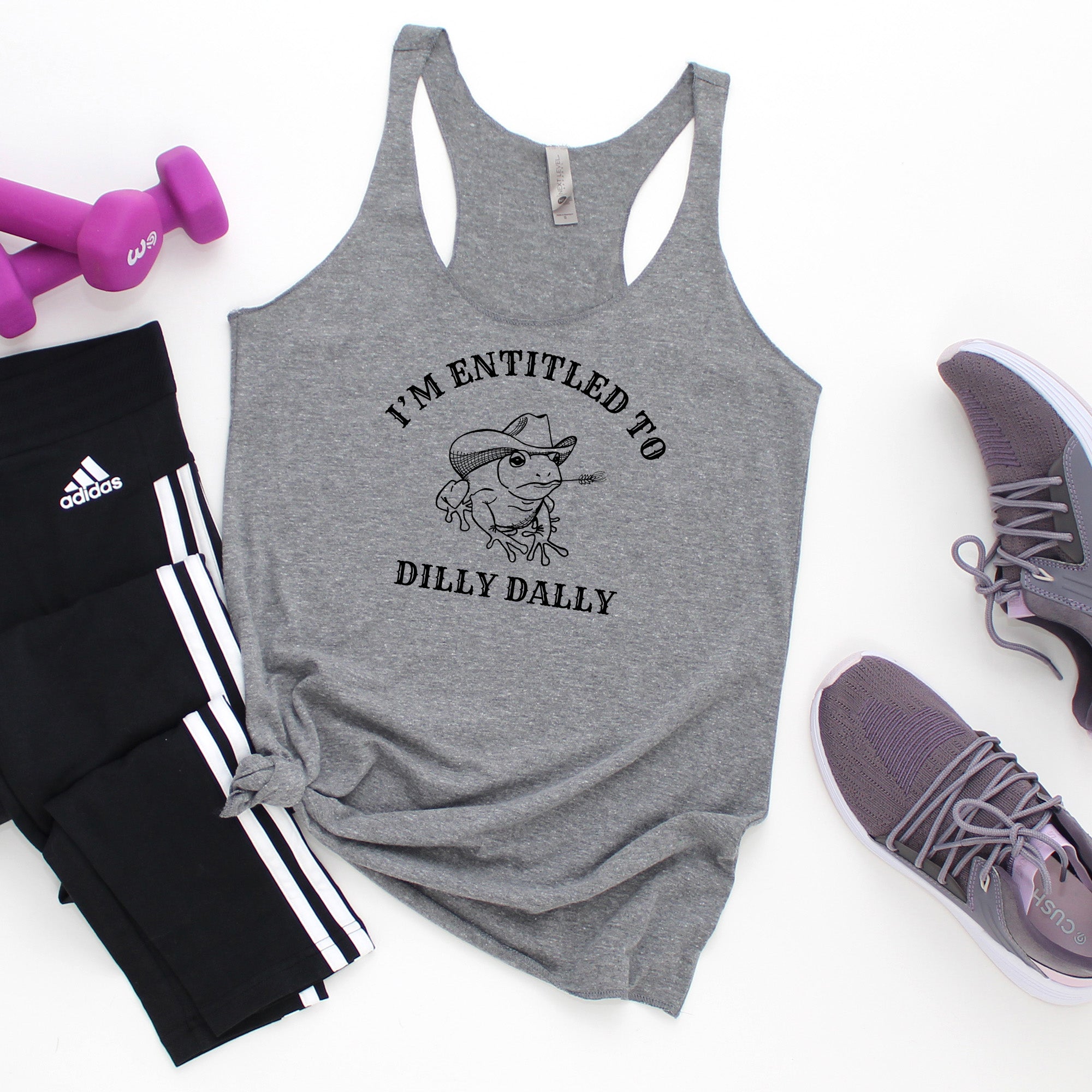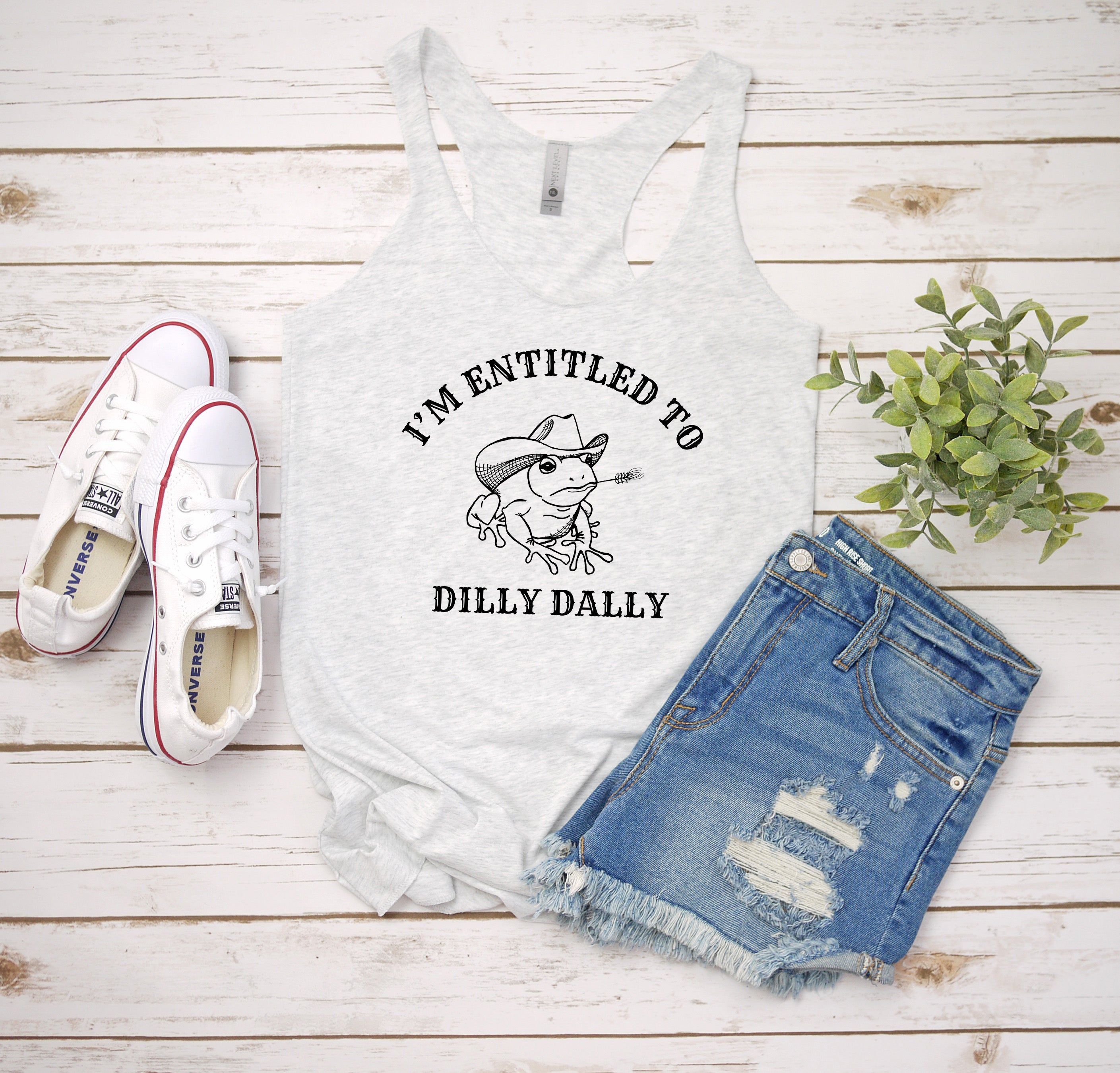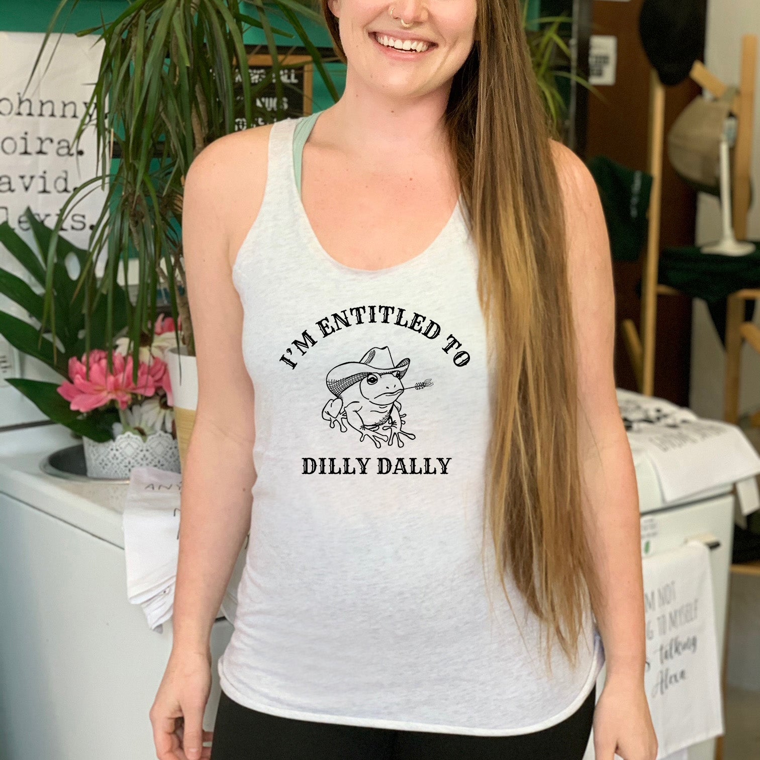 adult, handmade, womens, ladies, apparel, loose, relax, relaxed, comfy, casual, lighthearted, humor, humorous, joke, fun, happy, screenprinted, tanktop, workout, gifts, everyday, wear, I’m Entitled to Dilly Dally women’s tank, western frog graphic tank, cowboy hat frog design, animal apparel, funny animal shirt, first of all I’m a delight, viral gifts, gift for her, gift for him, birthday gift, gift for bestie, stocking stuffer, trendy pop culture tank, cottagecore, frog fashion, frog lover, frog accessories, farmhouse aesthetic top, funny animal apparel, whimsical frog design, quirky gift idea, western animal graphic, playful frog quote, dilly dally, trending animal quote shirt, western tank, farmhouse, summer top, meme