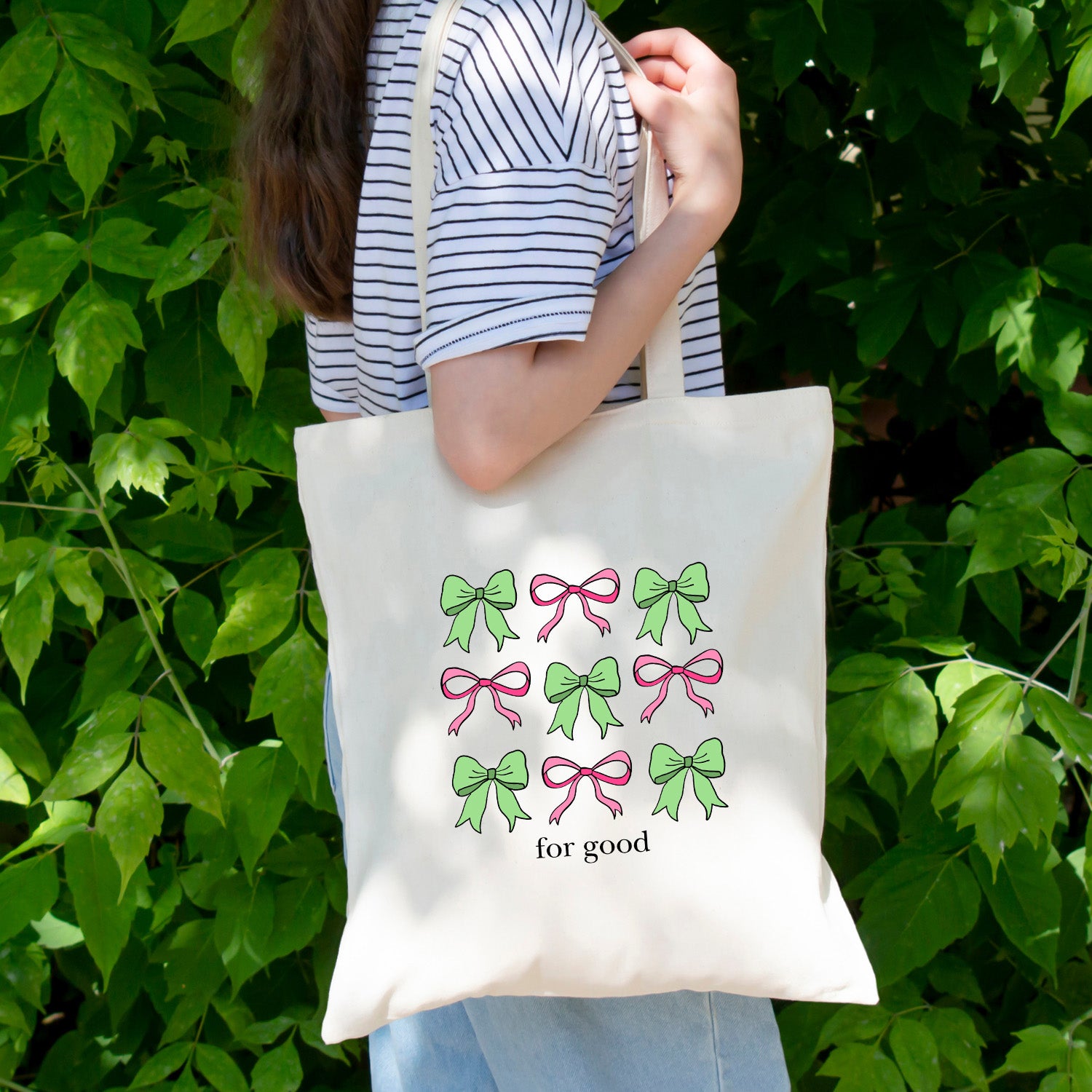 For Good tote bag, wicked accessories, wicked merch, trendy canvas tote, green and pink bows tote, For Good quote design, boutique best-seller bag, eco-friendly wicked inspired gift, reusable everyday bag, aesthetic pop culture tote, gift for her, gift for him, birthday gift, gift for bestie, stocking stuffer, wicked movie 2 inspired accessory, trendy market tote, stylish gift shop find, retail fashion accessory, cute boutique tote bag, feel-good daily carryall, must-have wicked themed bag
