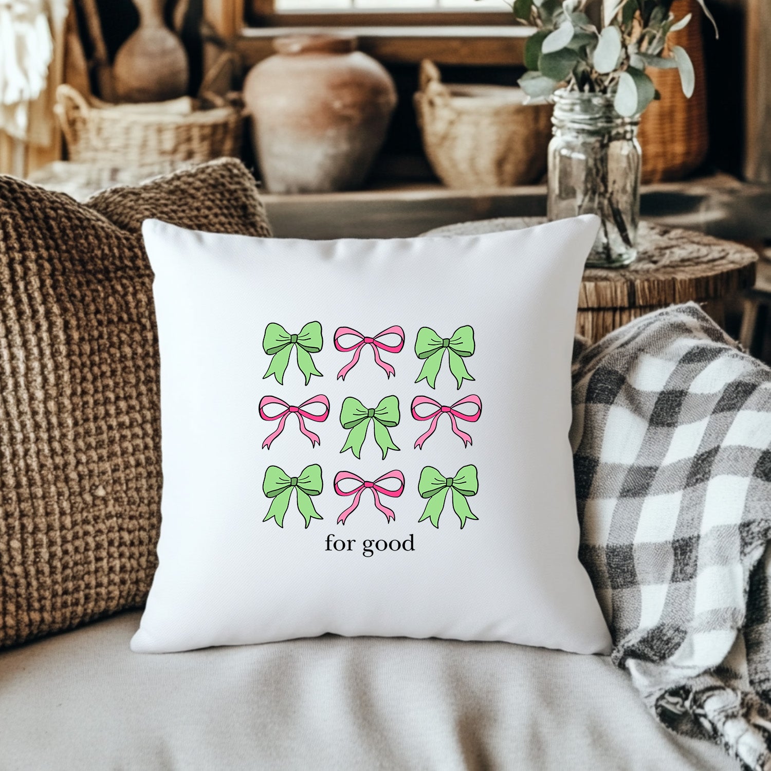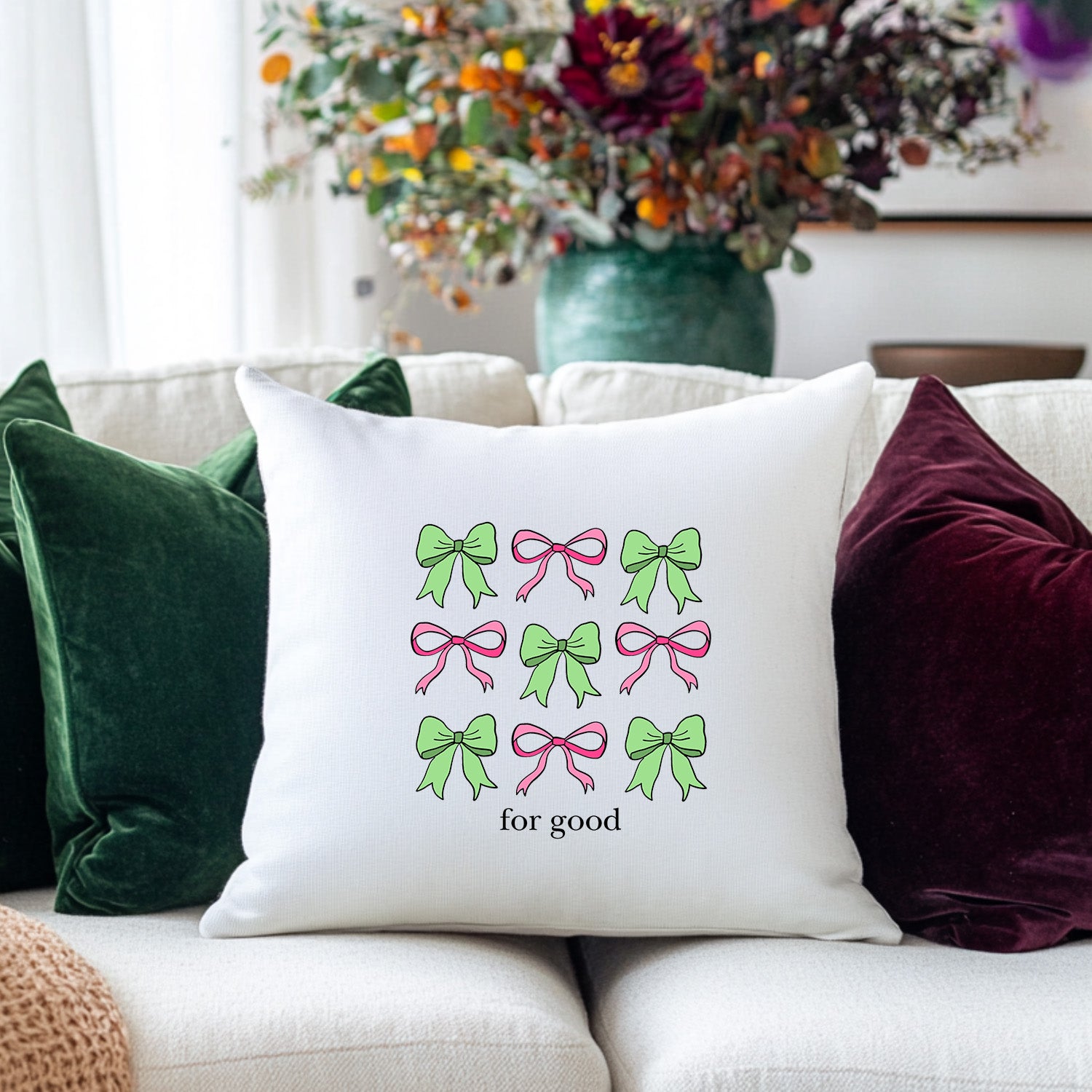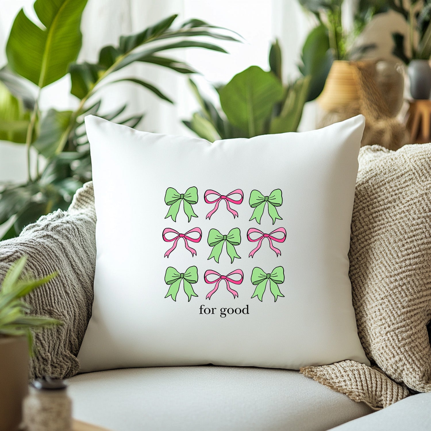 For Good throw pillow, wicked home decor, wicked merch, green and pink bow cushion, For Good quote design, wicked inspired gift, aesthetic couch pillow, boutique home item, gift for her, gift for him, birthday gift, gift for bestie, stocking stuffer, trendy room decor, cozy home accent, small shop bestseller, witchy aesthetic home piece, wicked movie inspired decor, soft pastel pillow design, retail display favorite, perfect boutique gift for Wicked fans