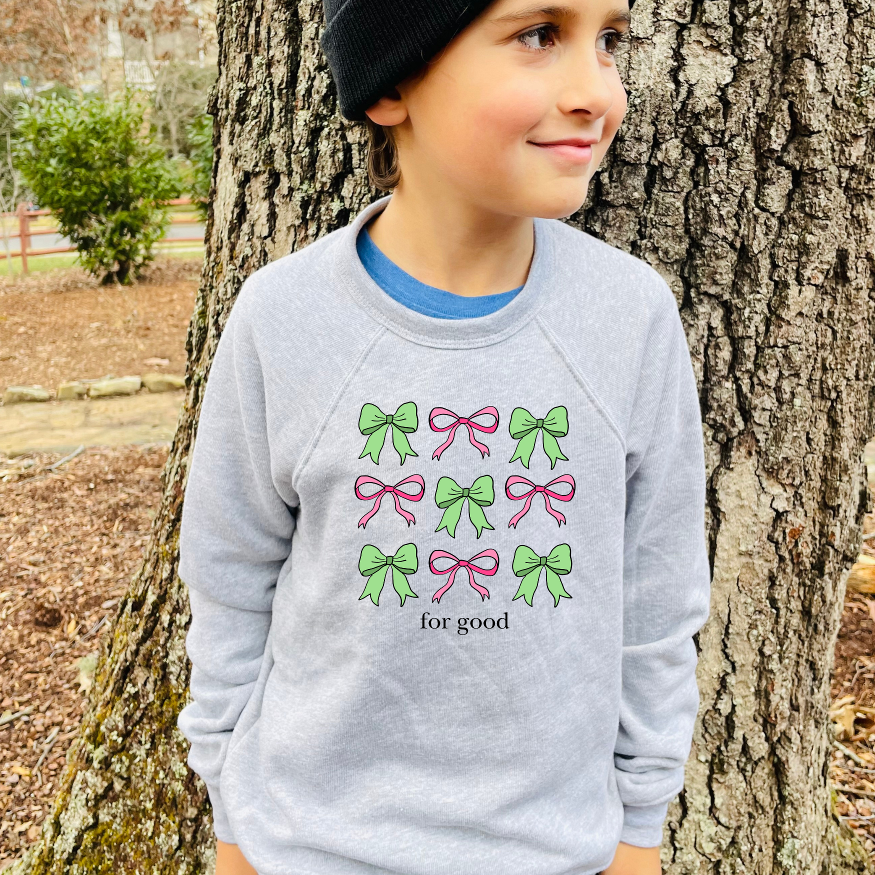 For Good kids sweatshirt, wicked kids apparel, wicked merch for children, cozy fleece sweatshirt, pink and green bow design, inspirational kids clothing, boutique kids fashion, gift for her, gift for him, birthday gift, gift for bestie, stocking stuffer, matching family outfit, wicked inspired kids top, soft boutique pullover, witchy aesthetic sweatshirt, small shop bestseller, trendy wicked movie merch, comfy and cute kids style, fall fashion for littles, must-have retail apparel