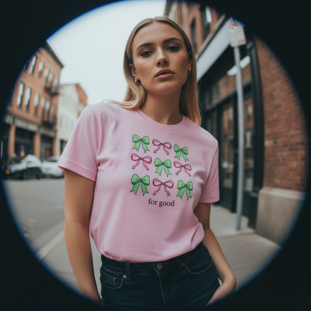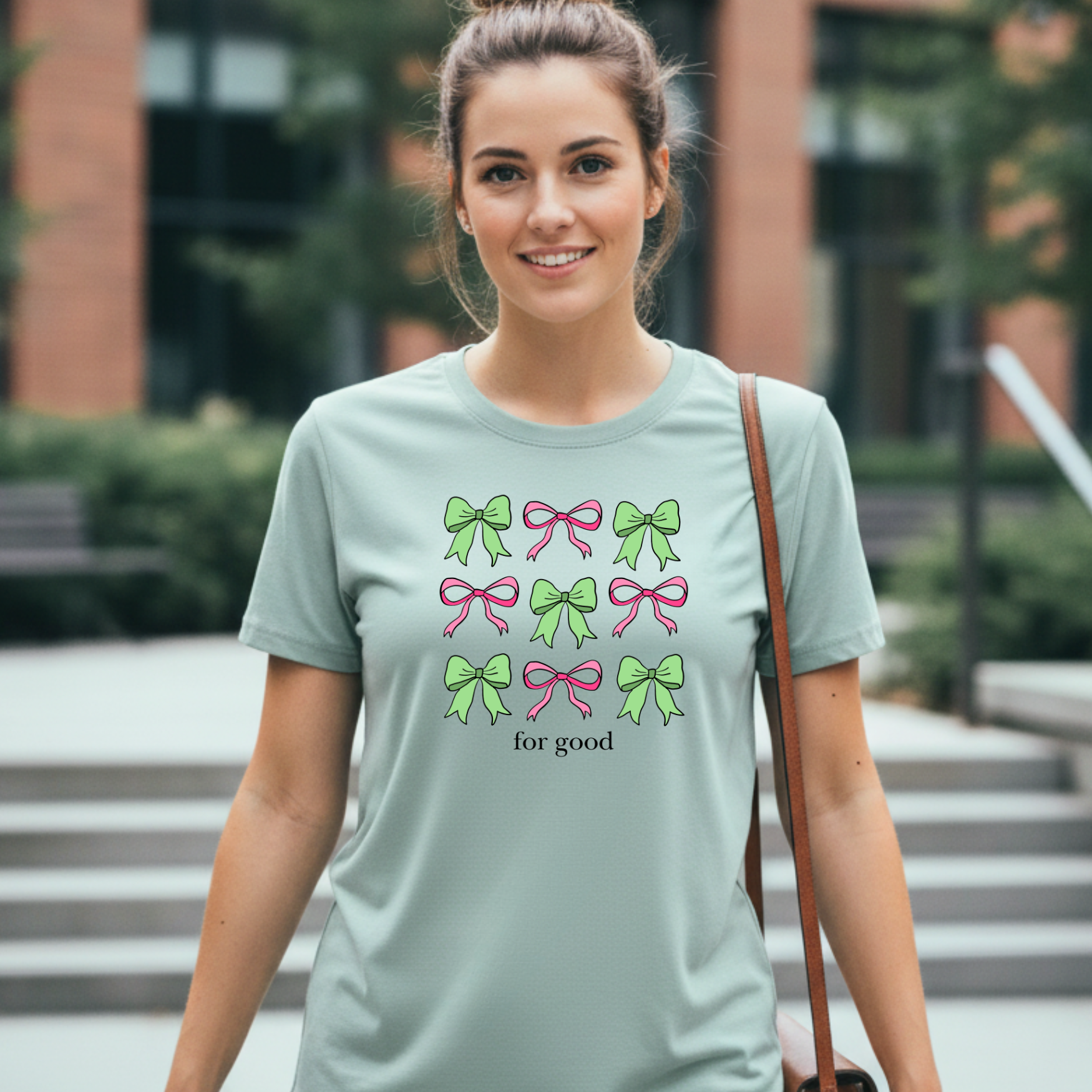 For Good t-shirt, wicked apparel, wicked inspired tee, wicked merch, green and pink bow design, positive message shirt, pop culture tee, boutique fashion essential, aesthetic unisex tee, gift for her, gift for him, birthday gift, gift for bestie, stocking stuffer, trendy wicked shirt for fans, feel-good cotton tee, small shop clothing line, comfy boutique top, witchy aesthetic tee, on-trend graphic shirt, perfect retail display piece, wicked inspired casual wear