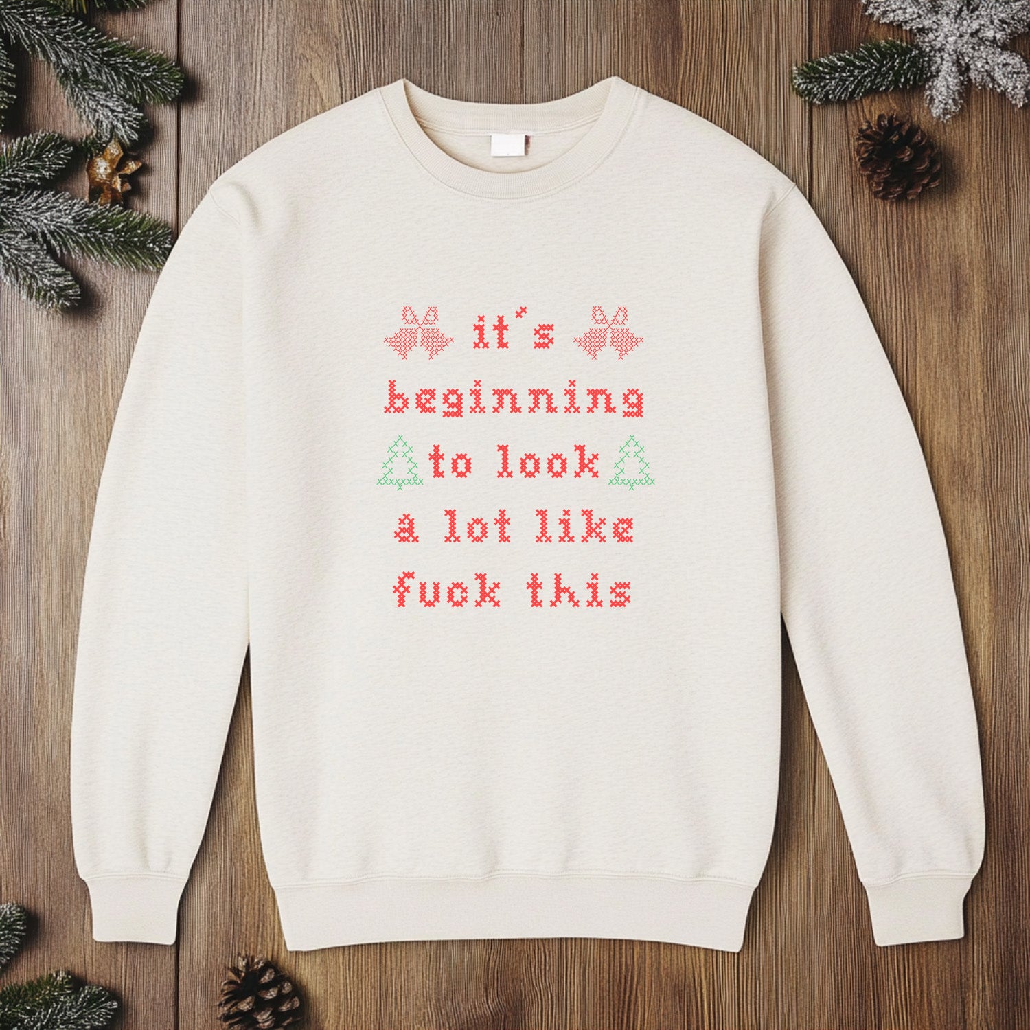 Keywords: funny christmas sweatshirt, sarcastic holiday pullover, it’s beginning to look a lot like fuck this sweater, cross stitch bells and trees design sweatshirt, cozy unisex holiday humor sweatshirt, oatmeal fleece sweatshirt, boutique christmas apparel, sarcastic christmas loungewear, holiday gag gift sweatshirt, festive boutique winter fashion, christmas party outfit sweatshirt, unique stocking stuffer idea, sarcastic ugly sweater party alternative, bold christmas humor pullover, trendy holiday novelty sweatshirt, edgy sarcastic holiday top, conversation starter christmas clothing, boutique holiday humor sweatshirt, funny christmas gift idea