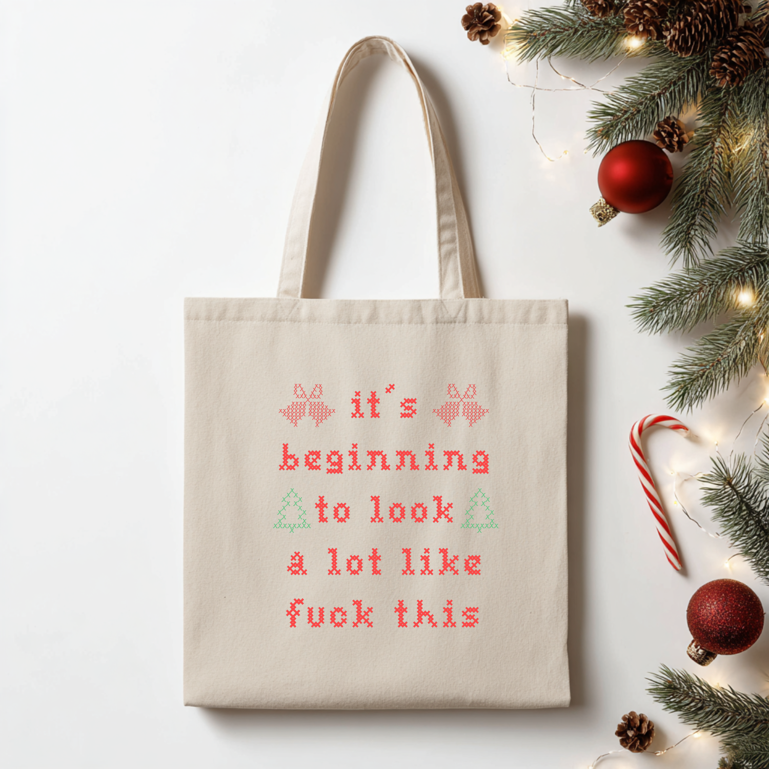 funny christmas tote bag, sarcastic holiday canvas tote, it’s beginning to look a lot like fuck this bag, cross stitch christmas bells and trees tote, quirky holiday humor shopper bag, boutique holiday tote, festive reusable christmas bag, sarcastic christmas gag gift, eco-friendly holiday tote bag, unique christmas stocking stuffer, holiday market tote shopper, modern sarcastic holiday accessory, bold christmas humor tote, trendy boutique holiday bag, conversation starter tote for christmas, funny santa humor gift bag, quirky reusable christmas tote, boutique christmas novelty tote bag