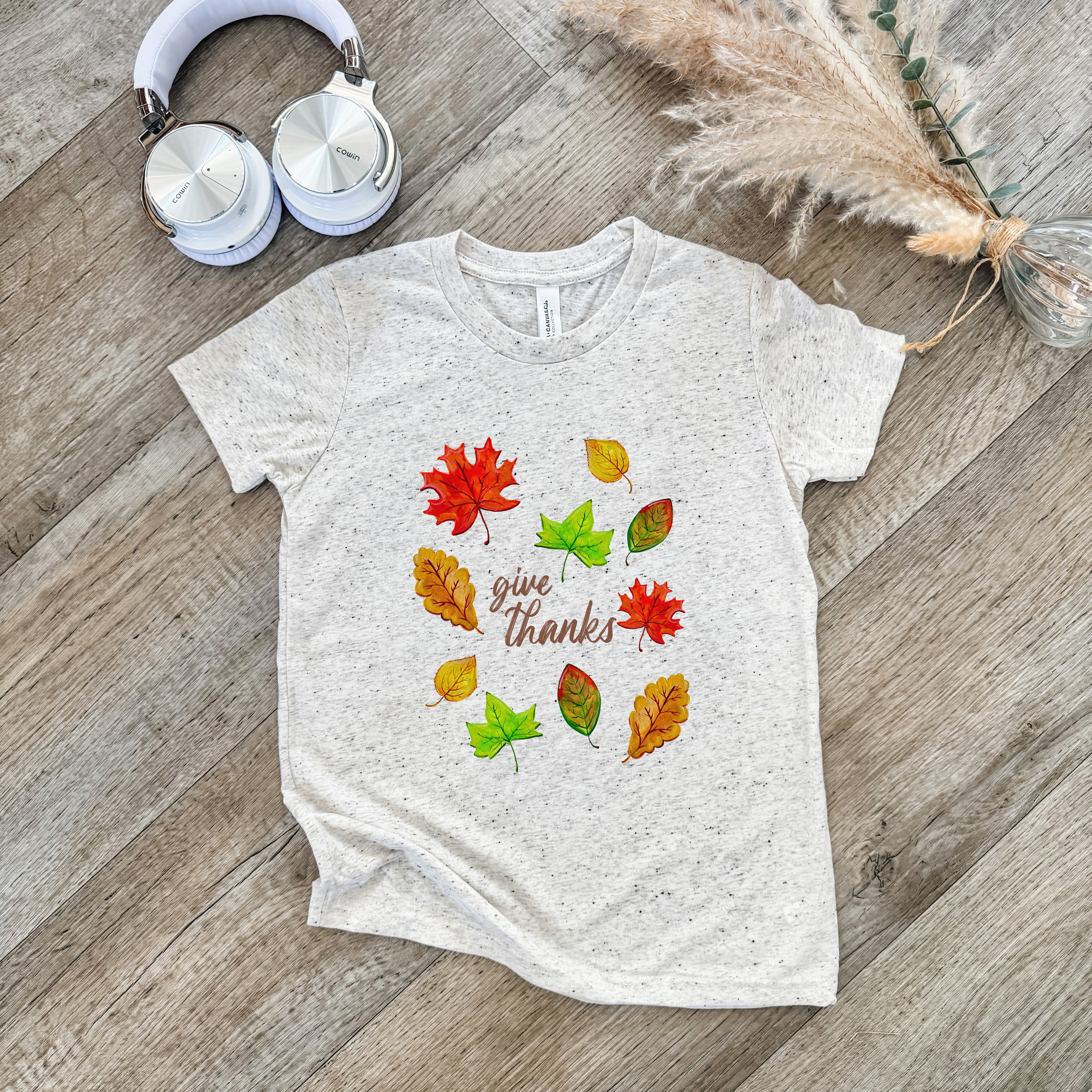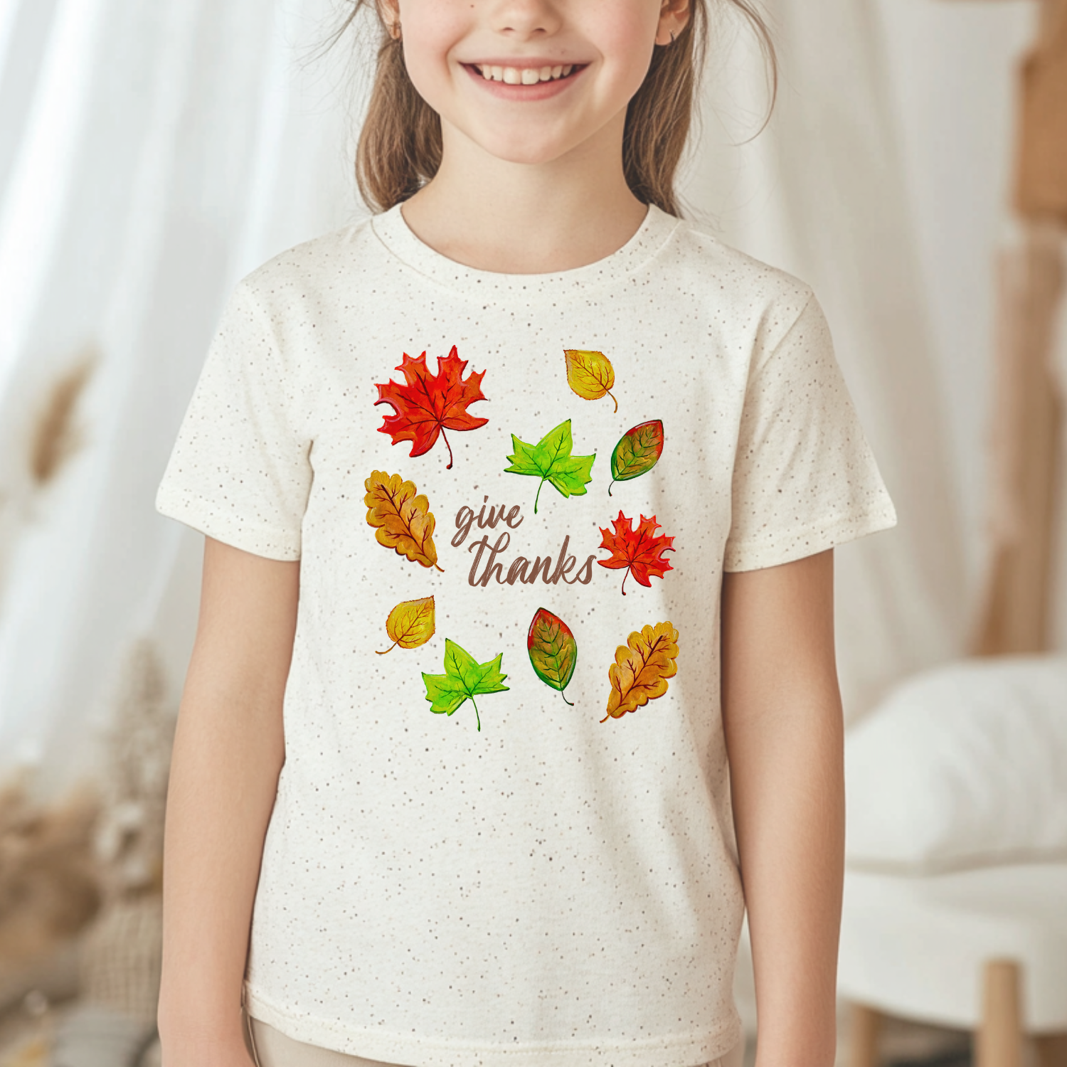 handmade, boy, apparel, loose, relax, relaxed, comfy, casual, soft, unisex, lighthearted, humor, humorous, joke, fun, happy, screenprinted, screen, printed, gifts, tops, gift, tshirt, graphic, funny, everyday, wear, every, day, kid, kids, girls, girl, boys, give thanks kids tee, thanksgiving toddler shirt, fall children’s t-shirt, watercolor fall leaves tee for kids, gratitude themed kids clothing, autumn boutique shirt, thanksgiving outfit for toddlers, kids harvest festival shirt, thanksgiving family photoshoot outfit, fall themed kids top