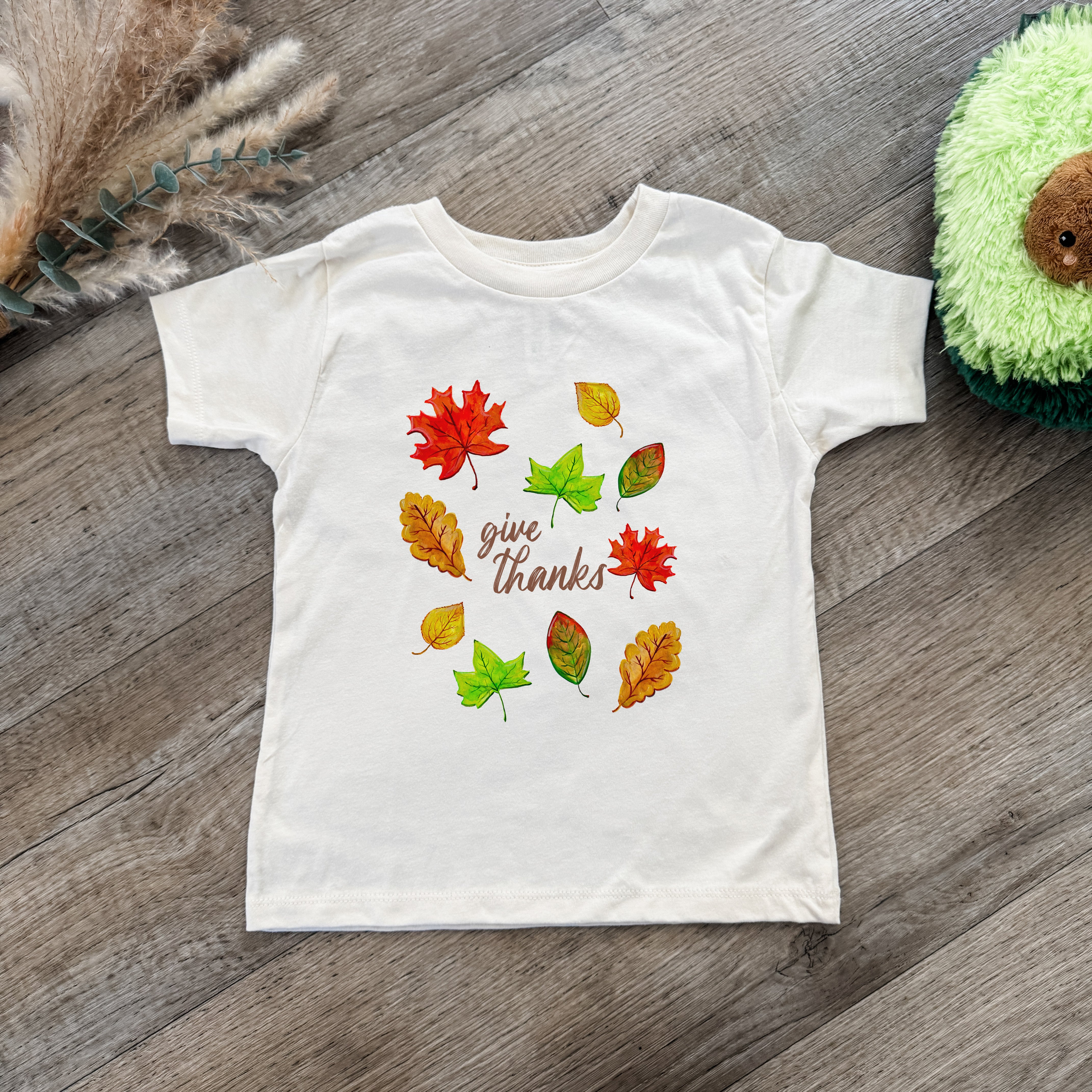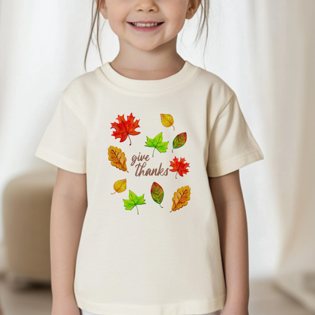 handmade, boy, apparel, loose, relax, relaxed, comfy, casual, soft, unisex, lighthearted, screenprinted, give thanks toddler shirt, thanksgiving toddler tee, fall toddler outfit, watercolor leaves shirt for toddlers, cozy autumn toddler clothing, baby’s first thanksgiving outfit, gratitude themed toddler t-shirt, fall festival kids outfit, thanksgiving family matching