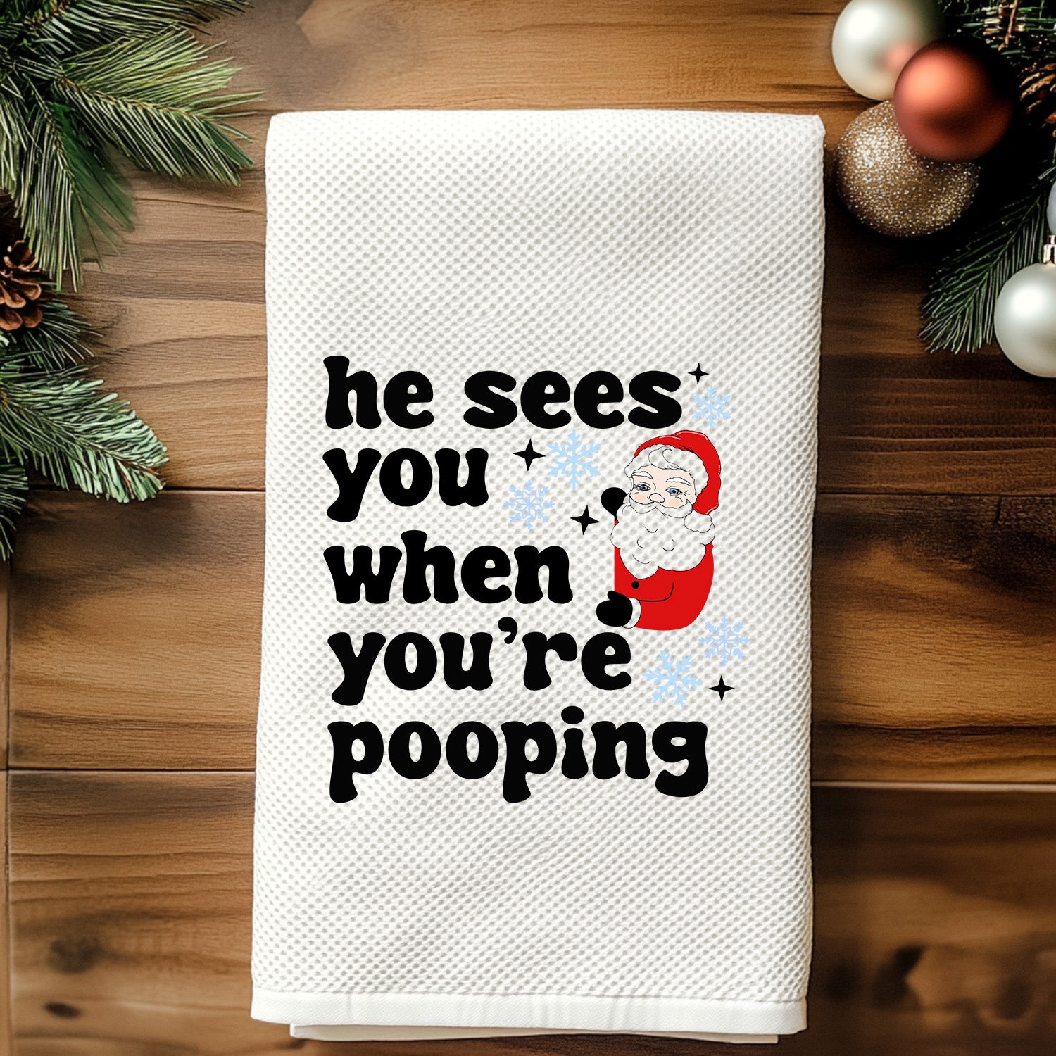 funny christmas kitchen towel, santa bathroom humor towel, holiday gag gift, christmas dish towel with santa, farmhouse christmas decor, rustic holiday kitchen towel, santa claus novelty gift, secret santa funny gift, stocking stuffer kitchen accessory, christmas kitchen linens, santa funny dish towel, christmas hostess gift, holiday party gag gift, christmas kitchen essentials, novelty holiday towel, santa bathroom joke gift, quirky christmas home decor, christmas gift under 20, holiday kitchen humor