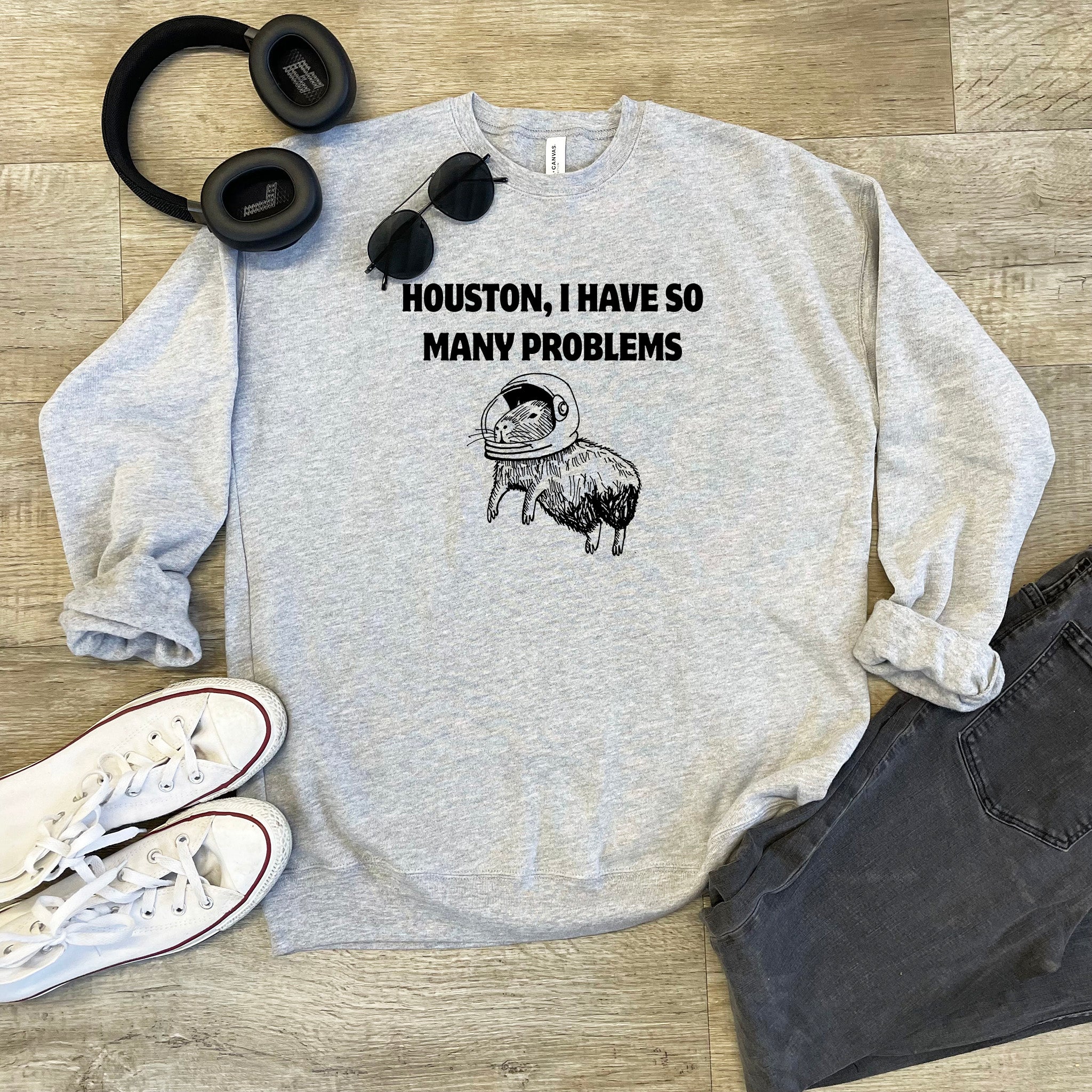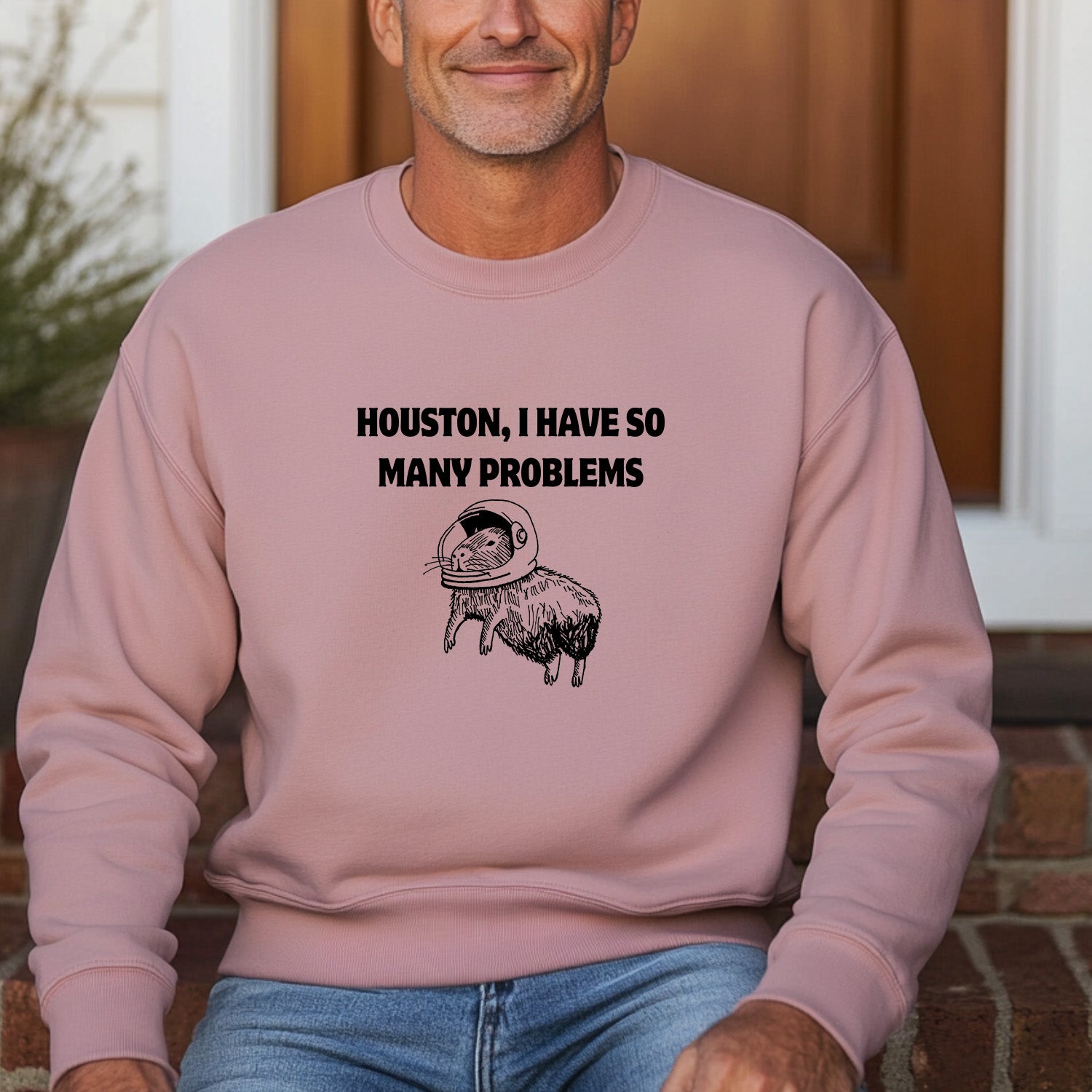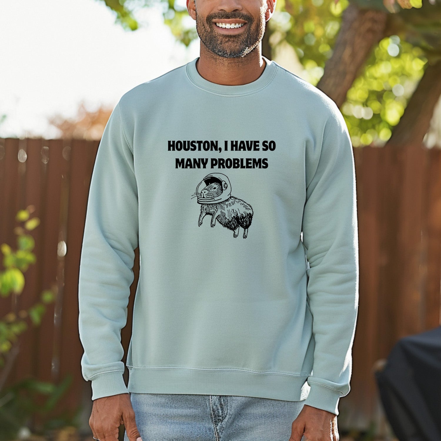 Keywords: sweater, pullover, sweatshirt, tshirt, adult, apparel, mens, relax, relaxed, fall, autumn, comfy, casual, unisex, lighthearted, humorous, joke, fun, happy, screenprinted, shirts with sayings, houston i have so many problems sweatshirt, funny capybara sweatshirt, space animal sweatshirt, astronaut animal hoodie, quirky humor sweatshirt, novelty animal pullover, trending funny sweatshirt, cozy fleece pullover, gift for her, gift for him, birthday gift, gift for bestie, stocking stuffer, unisex funny sweatshirt, cute animal sweatshirt, sarcastic quote sweatshirt, capybara graphic sweatshirt, space lover hoodie, comfy humor pullover, fall humor sweatshirt, internet meme sweatshirt, cute animal hoodie, shirts with sayings, shirts with puns, southern apparel, funny southern apparel, southern humor