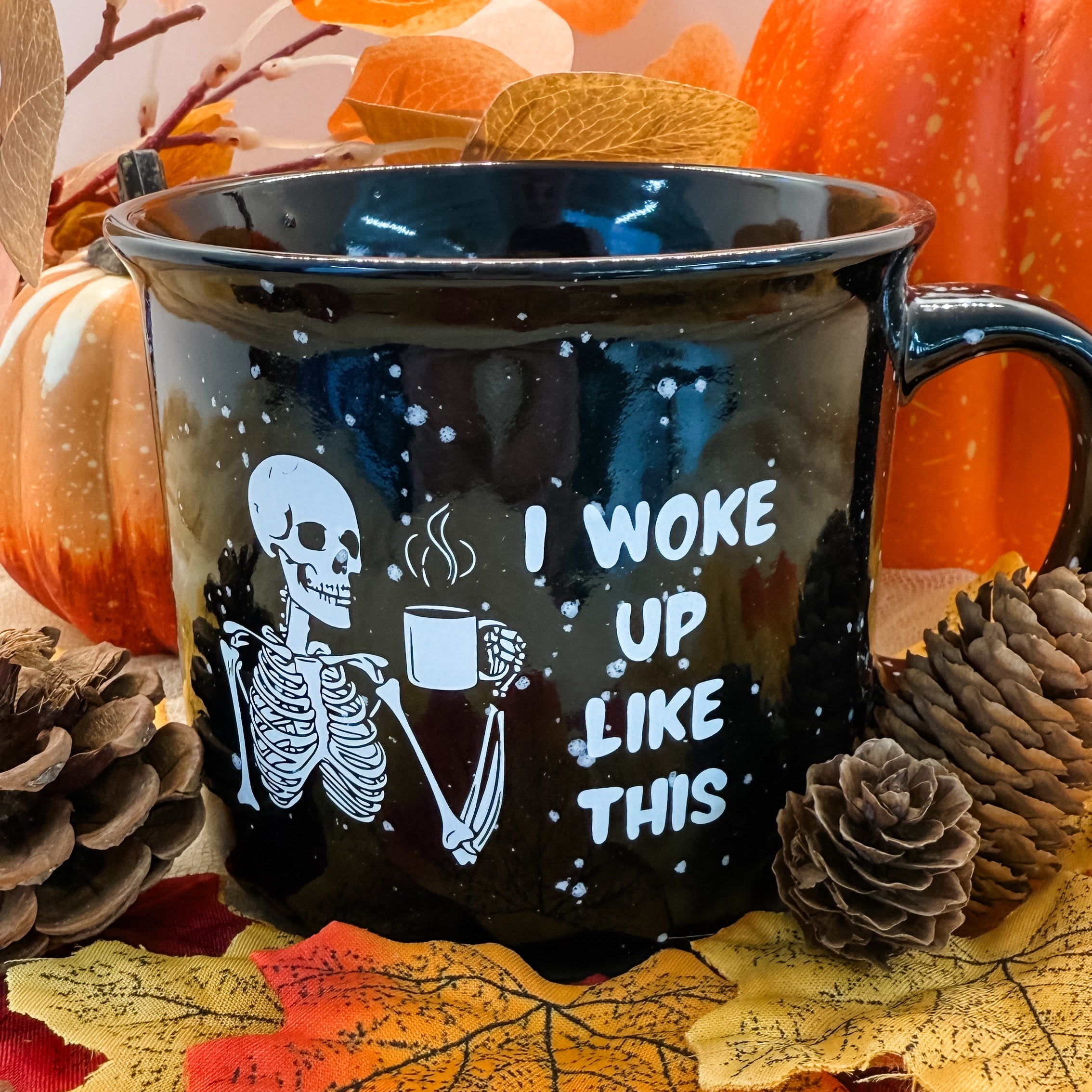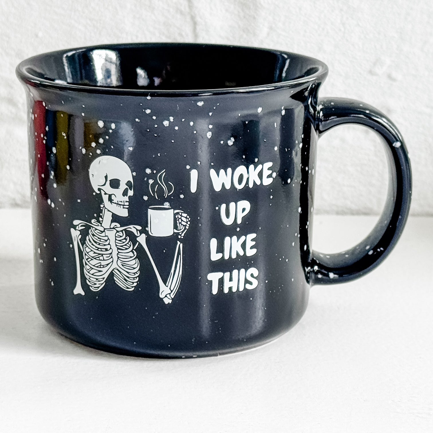 Keywords: home and living, drink ware, mugs, coffee, tea, mugs with sayings, mug gift, gift for bestie, funny ceramic mug, skeleton coffee mug, I woke up like this mug, spooky coffee cup, halloween mug, black campfire mug, speckled ceramic mug, skeleton humor gift, gothic kitchenware, cozy fall mug, spooky season coffee mug, skeleton lover gift, coffee skeleton design, halloween display item, dark humor mug, sarcastic coffee mug, gift for coffee lovers, funny halloween gift, boutique coffee mug, novelty fall mug, creepy cute mug, black coffee cup with skeleton, witchy coffee mug, fall decor, fall gift, halloween mug, halloween decor