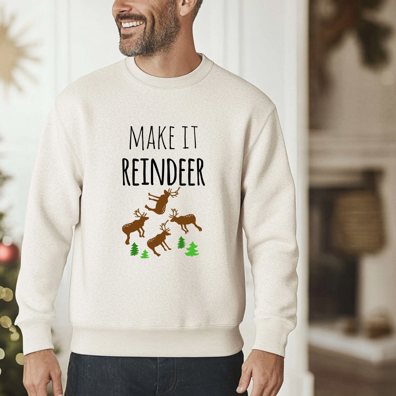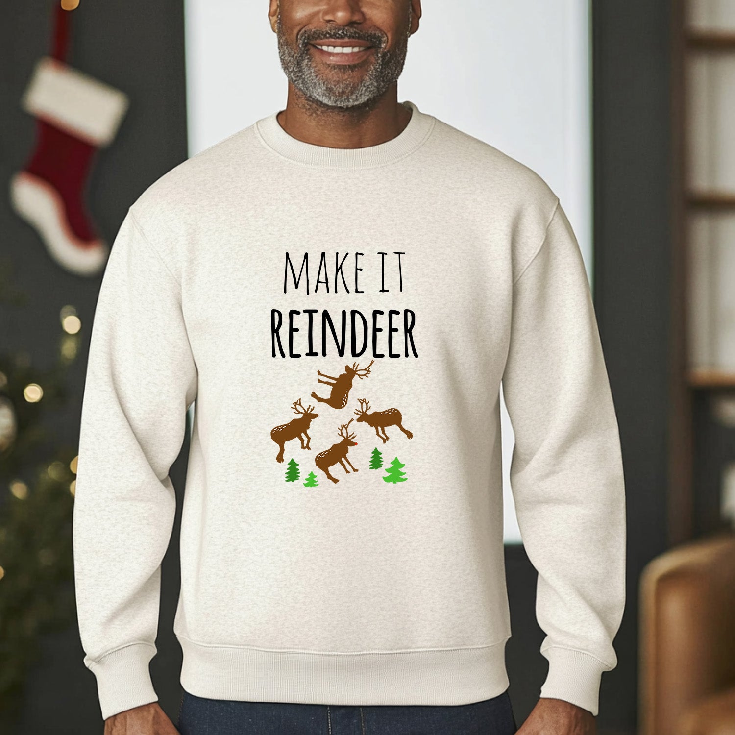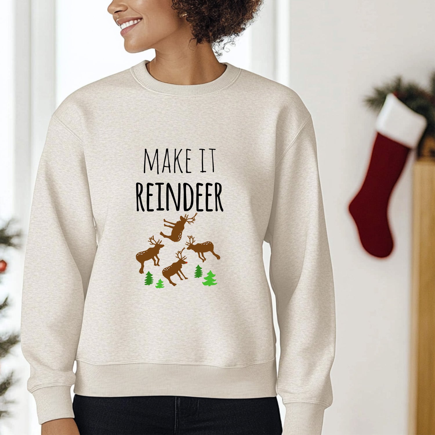 Keywords: make it reindeer christmas sweatshirt, funny holiday pullover with reindeer design, oatmeal festive unisex sweatshirt, quirky santa humor christmas clothing, novelty holiday humor sweatshirt, cozy winter pullover, boutique holiday apparel for adults, festive christmas party outfit, unique christmas humor sweater alternative, playful reindeer holiday sweatshirt, stocking stuffer holiday gift apparel, festive quirky boutique sweatshirt