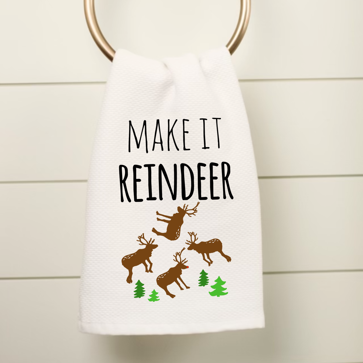 funny christmas hand towel, make it reindeer christmas hand towel, funny holiday waffle weave towel, quirky santa humor christmas towel, boutique festive bathroom linens, novelty holiday humor hand towel, festive quirky holiday kitchen towel, stocking stuffer holiday towel gift, farmhouse christmas humor decor, modern santa reindeer humor towel, cozy festive hand towel, playful holiday bathroom accessory, quirky reindeer falling towel for christmas, boutique holiday humor linens