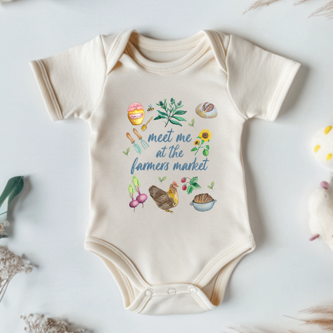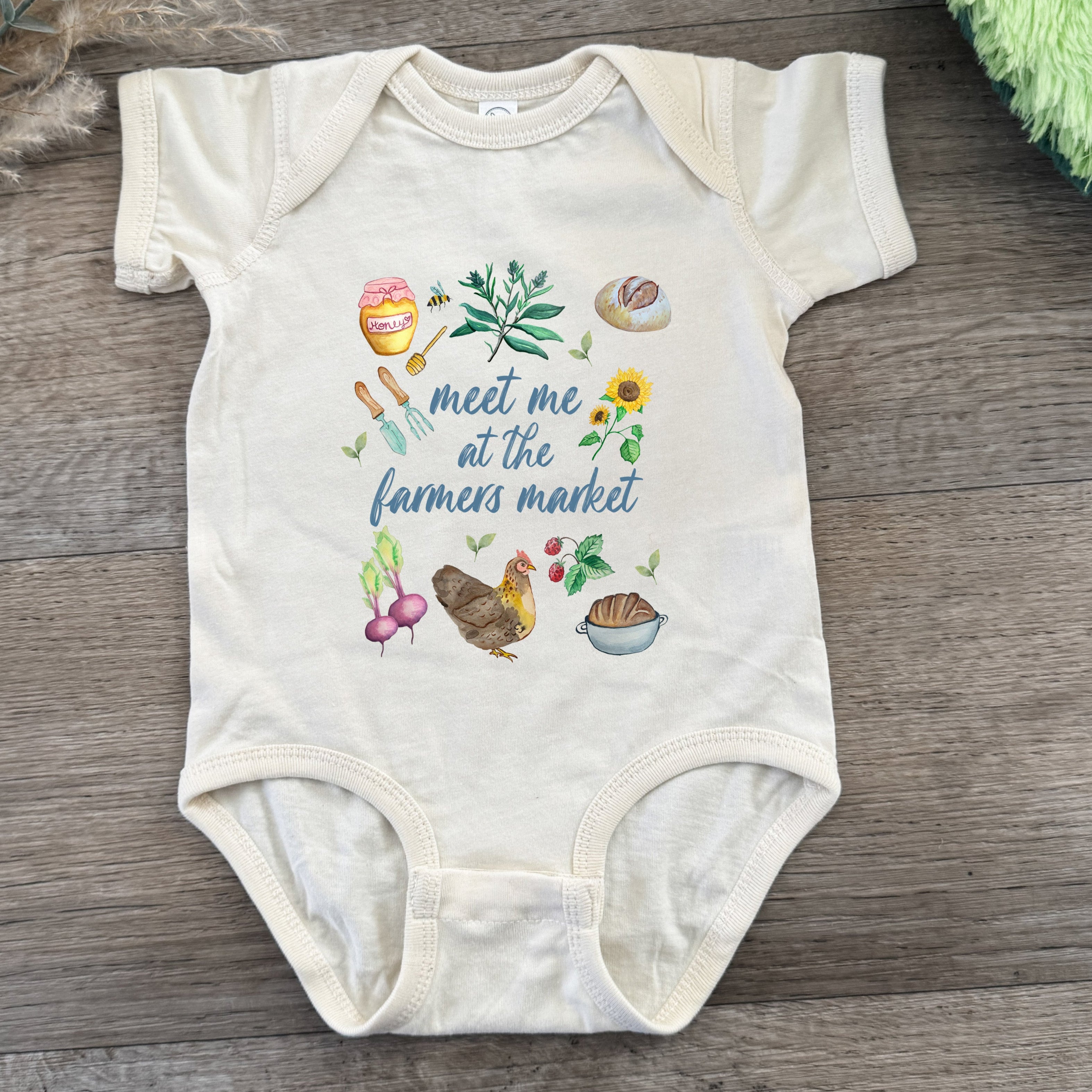 screenprinting, cute baby clothes, newborn gift, baby shower, baby costume, baby bodysuit, onesie, graphic onesie, soft baby clothes, comfortable, handmade, apparel, meet me at the farmer's market baby onesie, watercolor foodie infant bodysuit, rustic farmhouse baby clothes, honey and flowers baby outfit, bread and bees onesie, baby shower gift for foodie parents, gift shop baby apparel, farm-to-table newborn onesie, baby shower gift, farm