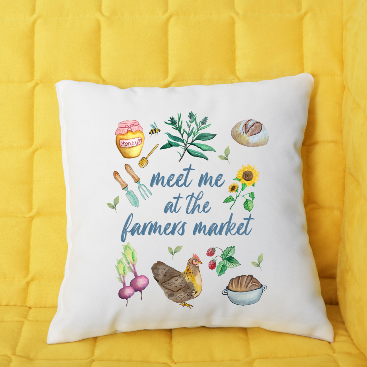 meet me at the farmer's market pillow, watercolor foodie throw pillow, rustic farmhouse home decor cushion, honey and flowers decorative pillow, bread and bees accent pillow, gift for farmer’s market lover, country home decor, foodie kitchen pillow, gift shop farmhouse pillow, cute throw pillows, farmhouse decor, farmhouse pillow, gift for hostess, gift for her, mother's day, farm, homesteading