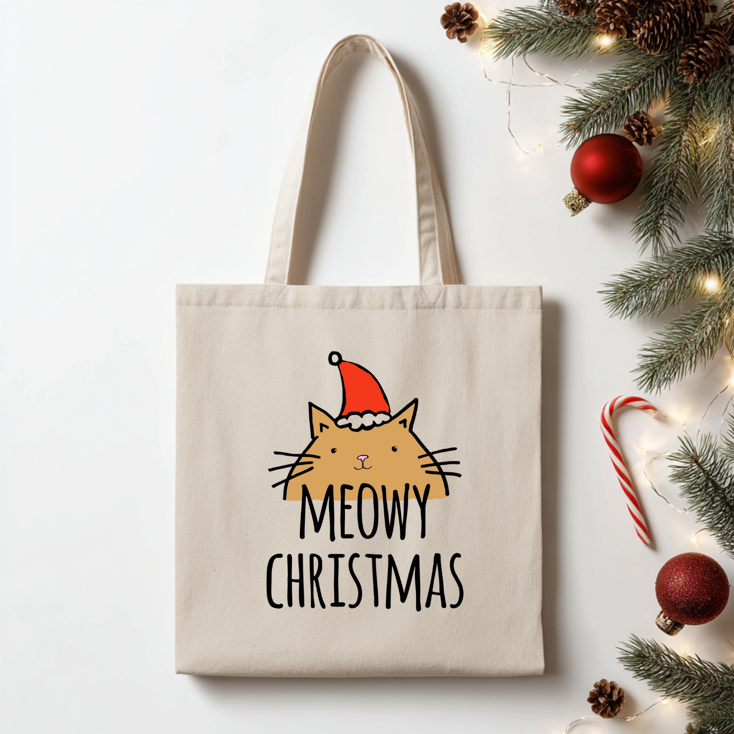 meowy christmas tote bag, cat holiday canvas shopper, funny santa hat cat christmas bag, festive quirky holiday reusable bag, boutique holiday shopper tote, novelty santa cat christmas tote, playful holiday humor bag, trendy eco-friendly christmas tote, cat lover holiday gift bag, stocking stuffer shopper bag, festive quirky holiday shopper, unique santa cat design tote, whimsical christmas humor tote, boutique festive holiday shopper bag, modern christmas reusable shopping bag