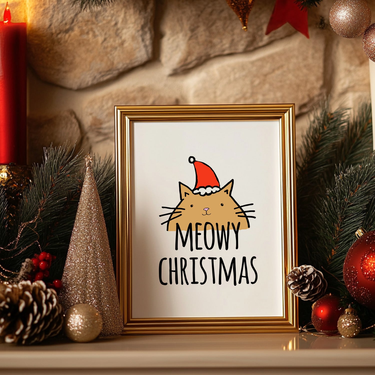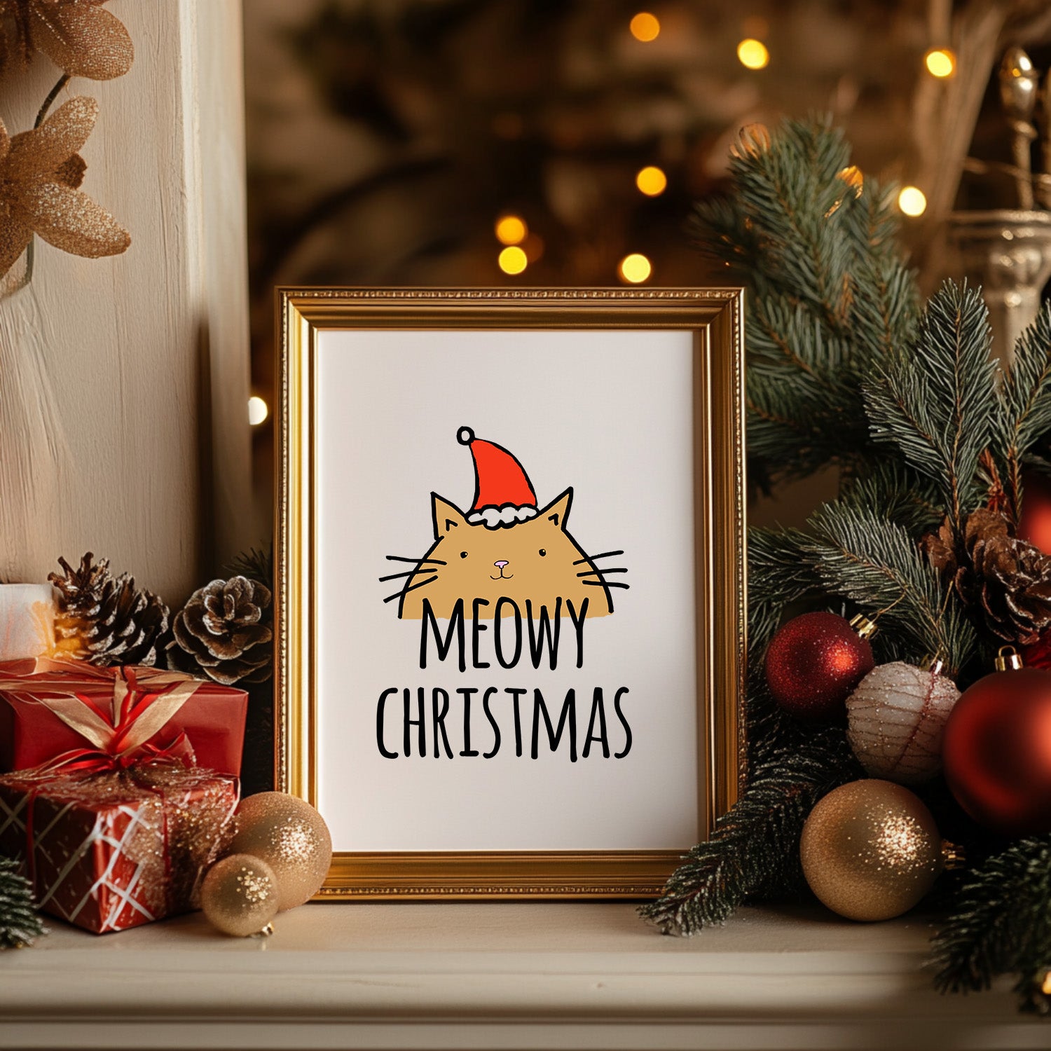 meowy christmas art print, cat holiday wall decor, santa hat cat christmas artwork, festive quirky holiday print, boutique holiday home decor, funny christmas art with cats, whimsical holiday wall art, novelty santa cat christmas print, playful christmas cat wall decoration, trendy holiday wall print for cat lovers, stocking stuffer christmas art, cozy festive home wall decor, quirky santa cat holiday illustration, boutique festive christmas artwork, unique holiday humor wall print