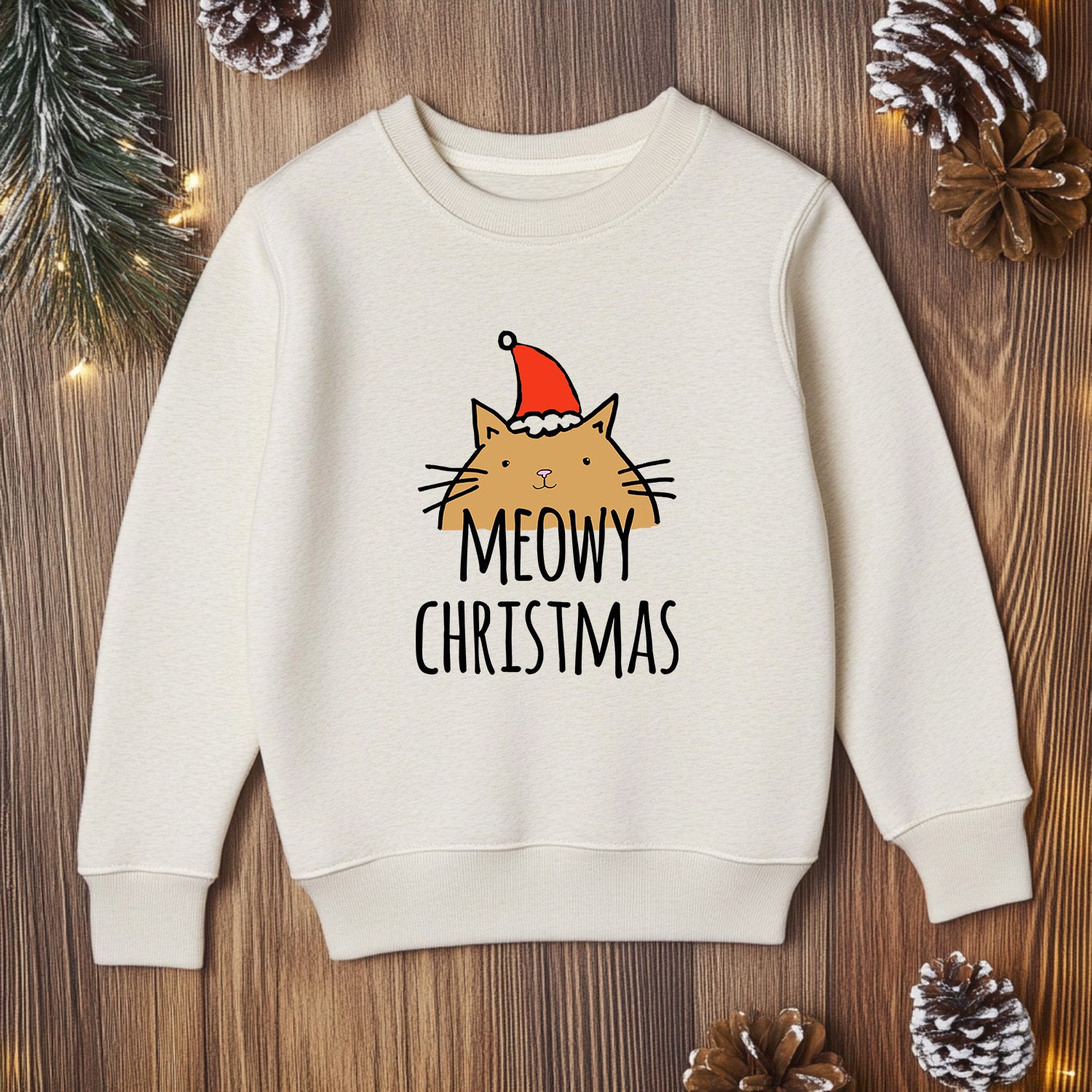 meowy christmas kids sweatshirt, cat christmas sweater for kids, funny holiday pullover with cat santa hat, cozy oatmeal kids christmas apparel, boutique children’s christmas sweatshirt, festive cat holiday clothing, novelty kids christmas cat design, quirky holiday humor sweatshirt for kids, christmas party outfit for children, santa cat holiday sweater, cute holiday sweatshirt for kids, stocking stuffer clothing for children, boutique kids christmas fashion, warm cozy holiday pullover for kids