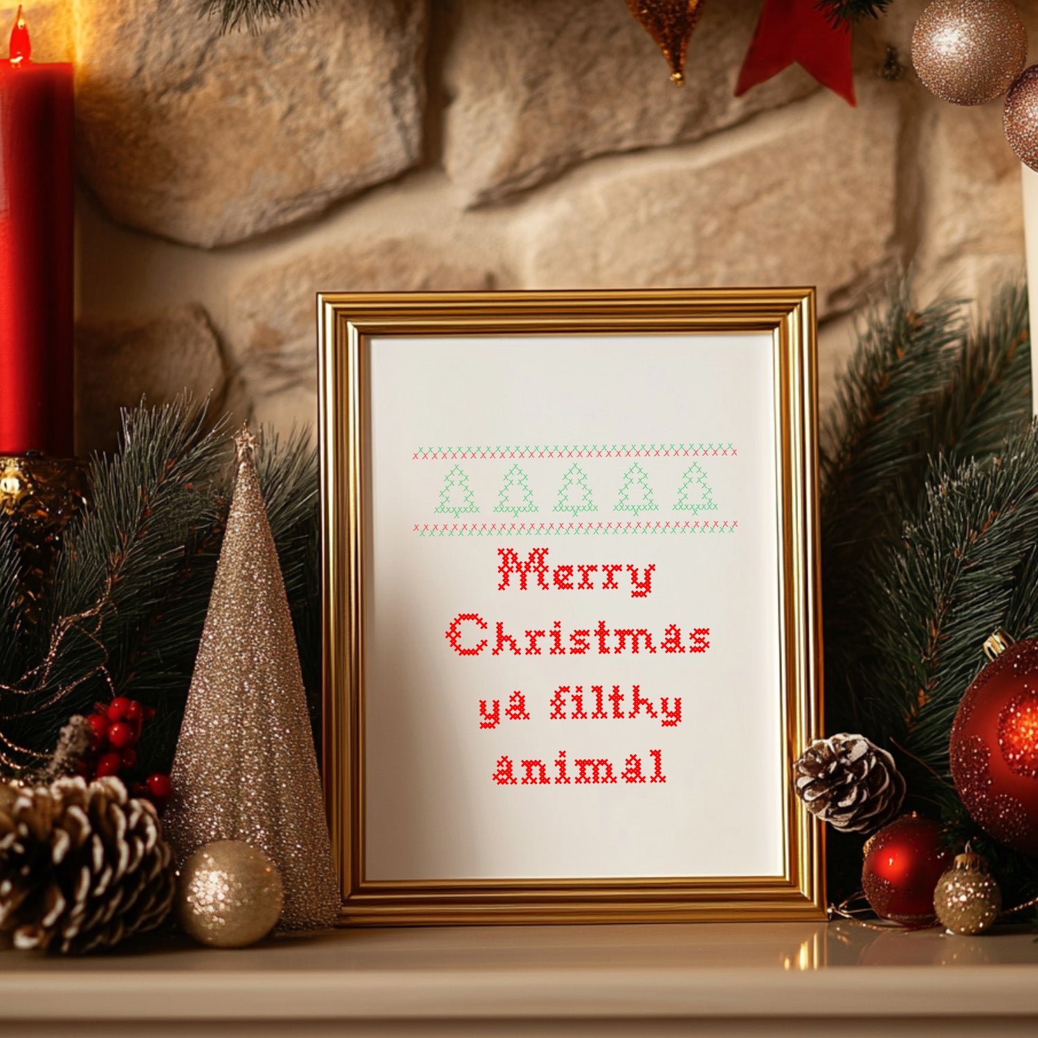 christmas wall art print, merry christmas ya filthy animal holiday artwork, funny home alone christmas art print, cross stitch design holiday wall decor, witty festive christmas print, retro inspired christmas wall art, humorous holiday boutique artwork, gag gift holiday wall print, cheeky christmas wall decor, novelty festive holiday print, farmhouse christmas wall artwork, playful christmas home decor print, boutique witty holiday wall art, seasonal humorous christmas wall piece, unique retro holiday art print