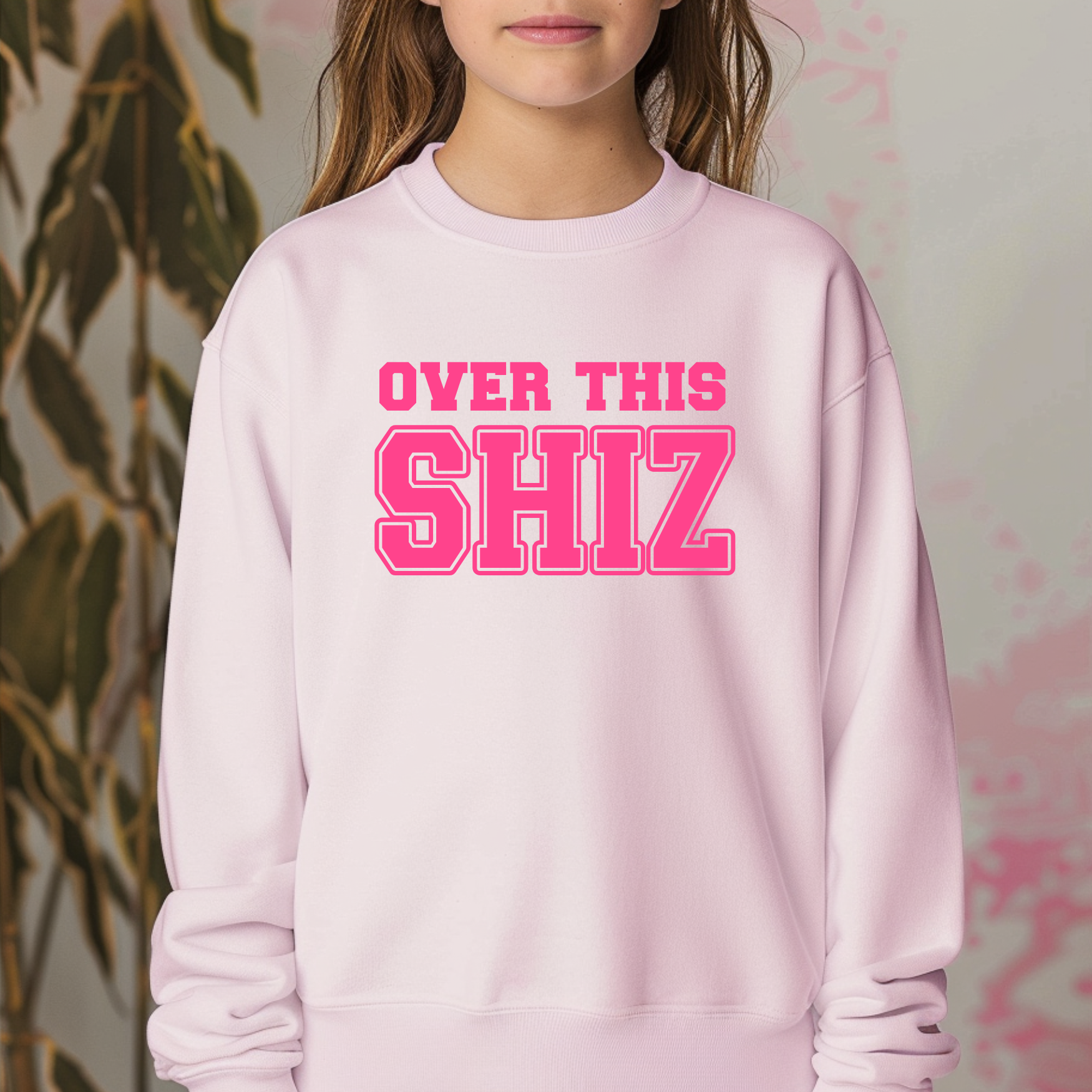 Over This Shiz kids sweatshirt, wicked kids apparel, wicked merch for children, wicked inspired sweatshirt, Shiz University pun design, broom crown wand and hat kids pullover, sparkly witchy kids sweatshirt, pink and green aesthetic, witchy pastel kids clothing, cozy fleece pullover, boutique kids fashion, magical fandom top, pop culture inspired sweatshirt, gift for her, gift for him, birthday gift, gift for bestie, stocking stuffer, small shop bestseller, witchcore kids style, trendy boutique apparel, comfy cozy sweatshirt, wicked themed design, sparkly witchy kids top, boutique fashion essential, magical pop culture kids sweatshirt, sparkly kids pullover, retail ready kids top, boutique bestseller, whimsical Shiz University pun kids pullover, humorous Wicked kids pullover