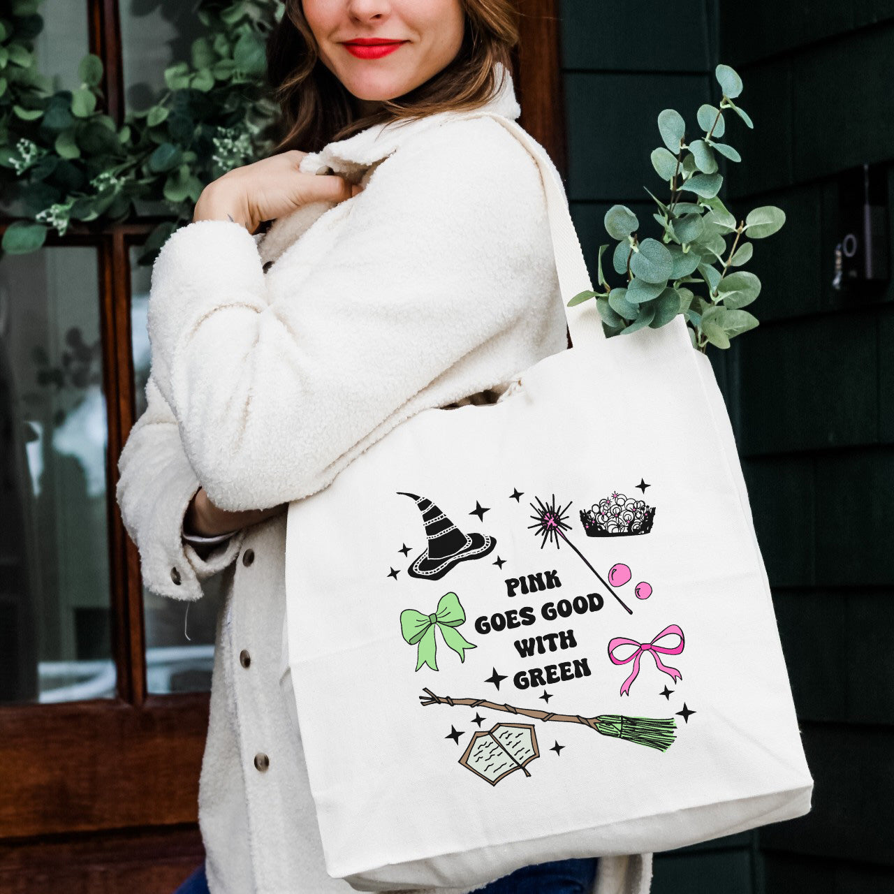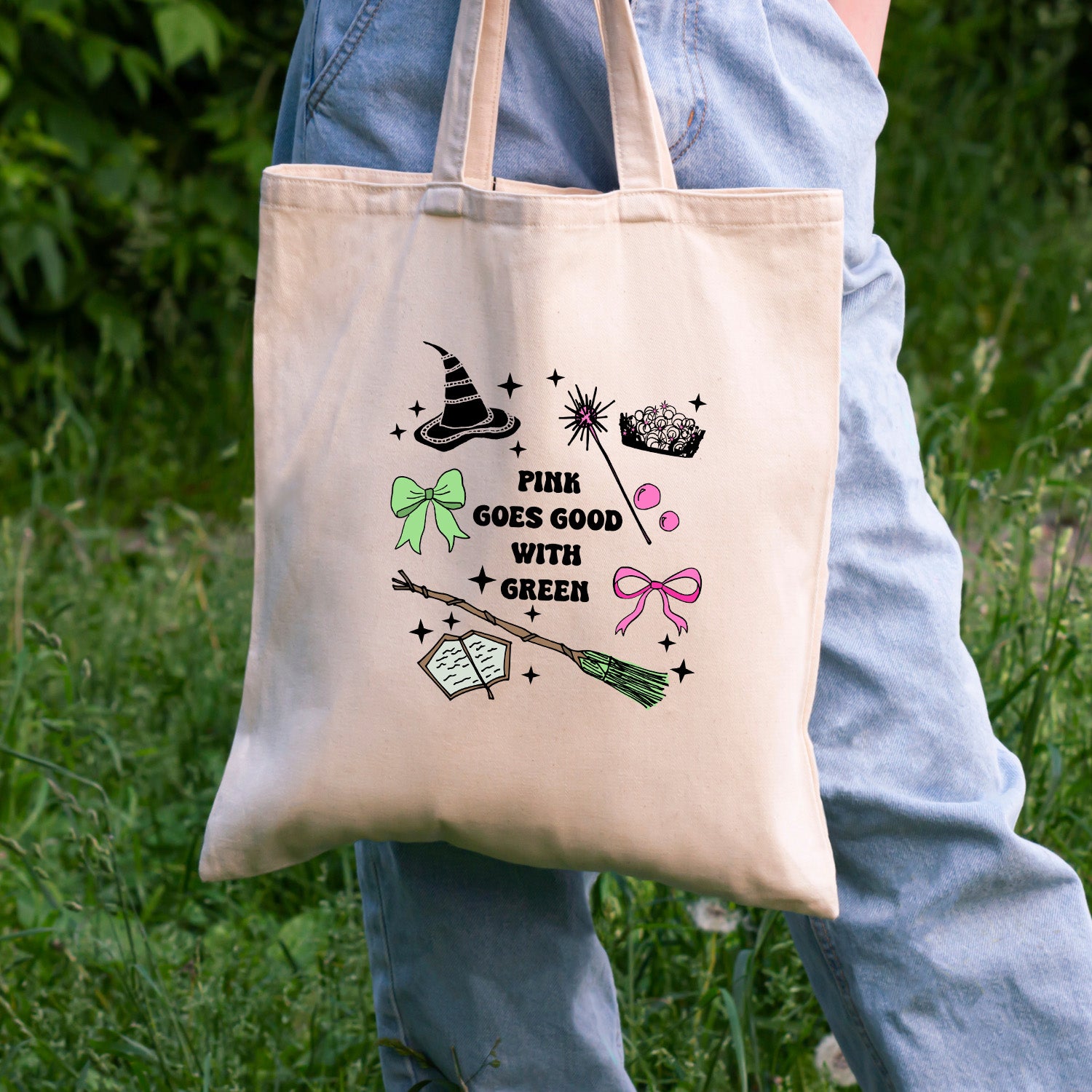 Pink Goes Good With Green tote bag, wicked accessories, wicked merch, wicked inspired tote, witchy collage tote, wand and broom design, pink and green aesthetic bag, boutique fashion accessory, pop culture tote, reusable canvas bag, eco-friendly boutique essential, gift for her, gift for him, birthday gift, gift for bestie, stocking stuffer, trendy wicked bag, retail ready accessory, witchcore fashion tote, stylish everyday bag, small shop bestseller, magical boutique merch, wicked tote, pink goes good with green, wicked accessories, wicked merch, wicked inspired bag, witchcore tote, pastel tote, green pink tote, magical accessory, pop culture bag, wicked movie 2, fandom tote, trendy tote bag, boutique accessory, witchy bag, aesthetic tote, wicked gift, reusable tote, small shop fashion, retail bestseller, gift for her, gift for him, birthday gift, gift for bestie, stocking stuffer
