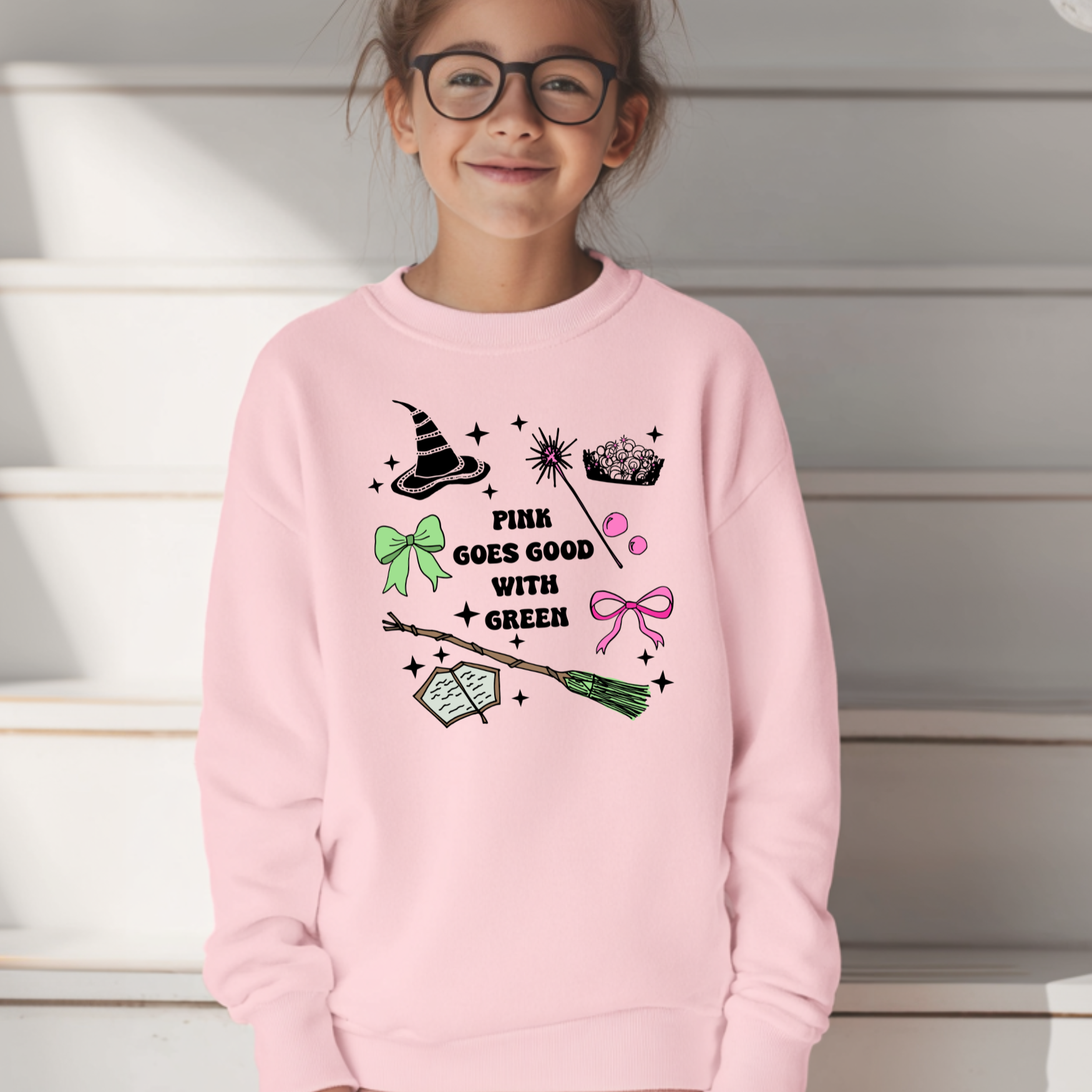Pink Goes Good With Green kids sweatshirt, wicked kids apparel, wicked merch for children, witchy collage sweatshirt, pink and green aesthetic top, cozy fleece sweatshirt, boutique kids fashion, magical wicked design, pop culture kids clothing, gift for her, gift for him, birthday gift, gift for bestie, stocking stuffer, wicked inspired outfit, trendy fall kids style, small shop bestseller, comfy boutique pullover, witchcore kids sweatshirt, wicked themed fashion, pastel sparkle design, wicked kids sweatshirt, pink goes good with green, wicked merch, wicked apparel, witchy kids clothes, green pink sweatshirt, wicked movie 2, pop culture kids fashion, boutique kids apparel, magical sweatshirt, witchcore style, retail bestseller, fandom kids outfit, wicked gift, cozy kids top, aesthetic kids sweatshirt, boutique fashion, comfy fleece, gift for her, gift for him, birthday gift, gift for bestie, stocking stuffer