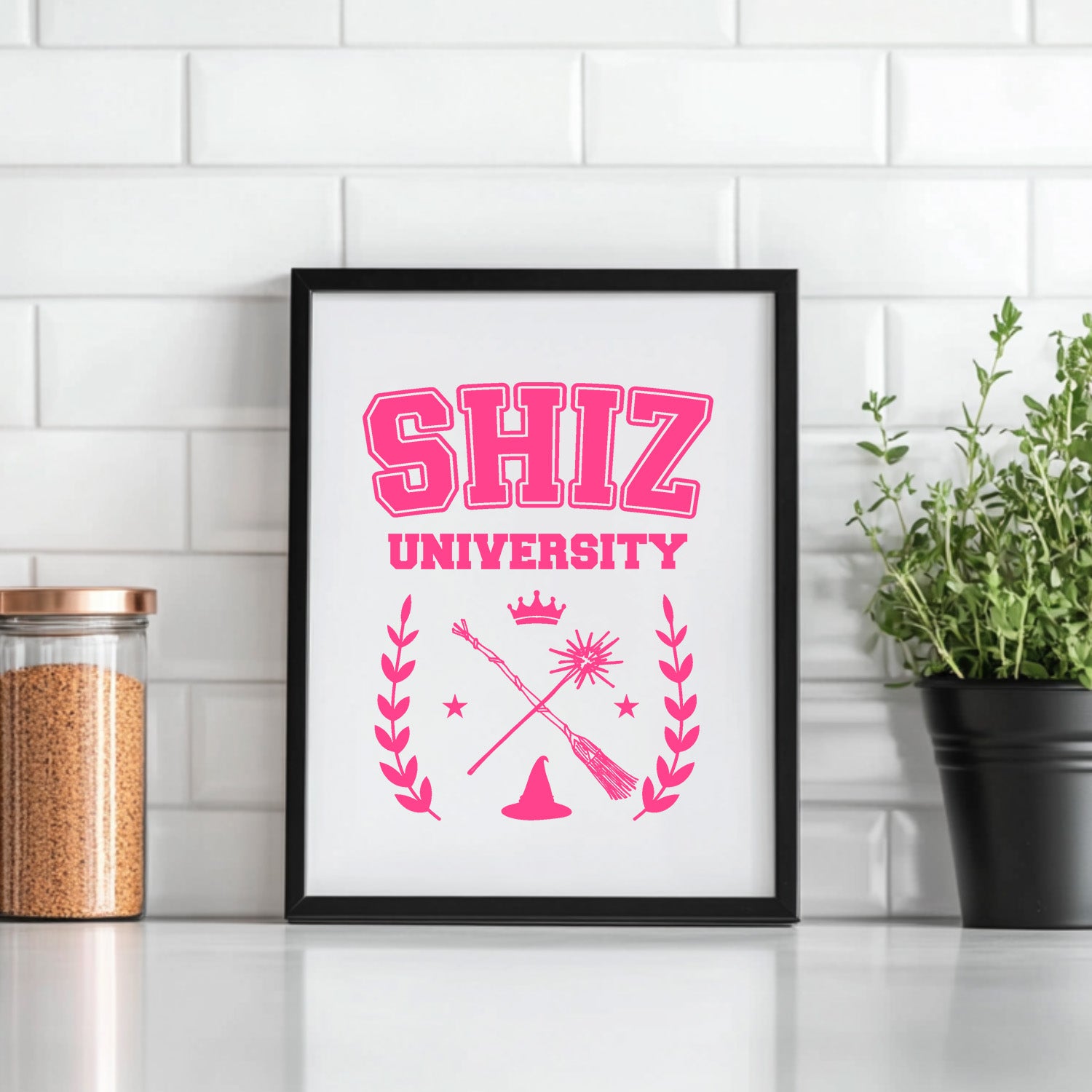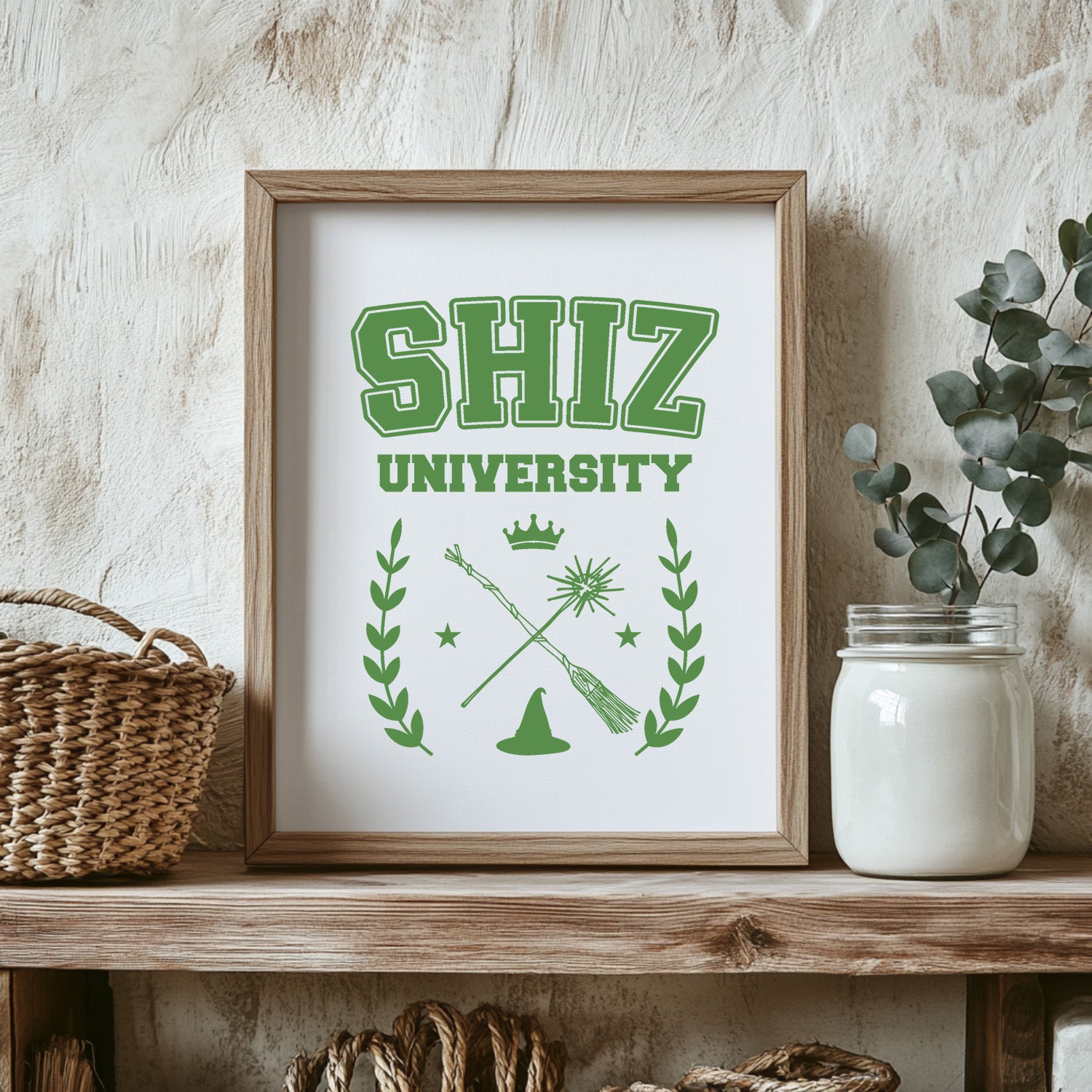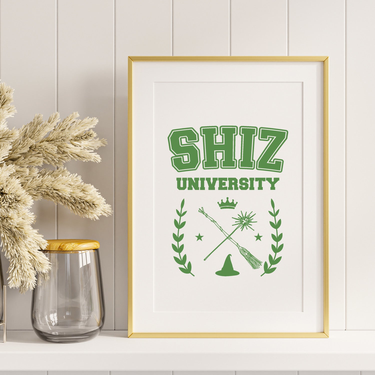 Shiz University art print, wicked wall art, wicked inspired print, college crest art, broom crown wand and hat design, sparkly witchy quote artwork, pink and green aesthetic wall art, boutique home decor, magical typography print, pop culture wall print, collectible Wicked art, small shop wall decor, boutique display piece, retail ready wall art, fandom wall decor, whimsical witchy quote print, witchcore home accent, aesthetic room artwork, sparkling quote print, cottagecore wall decor, boutique home accent, trending small shop art, gift for her, gift for him, birthday gift, gift for bestie, stocking stuffer, wicked merch, pop culture wall print, magical home decor, boutique collectible print, pink and green art, sparkly Shiz University fan art, whimsical Wicked fan art, wizardry themed print