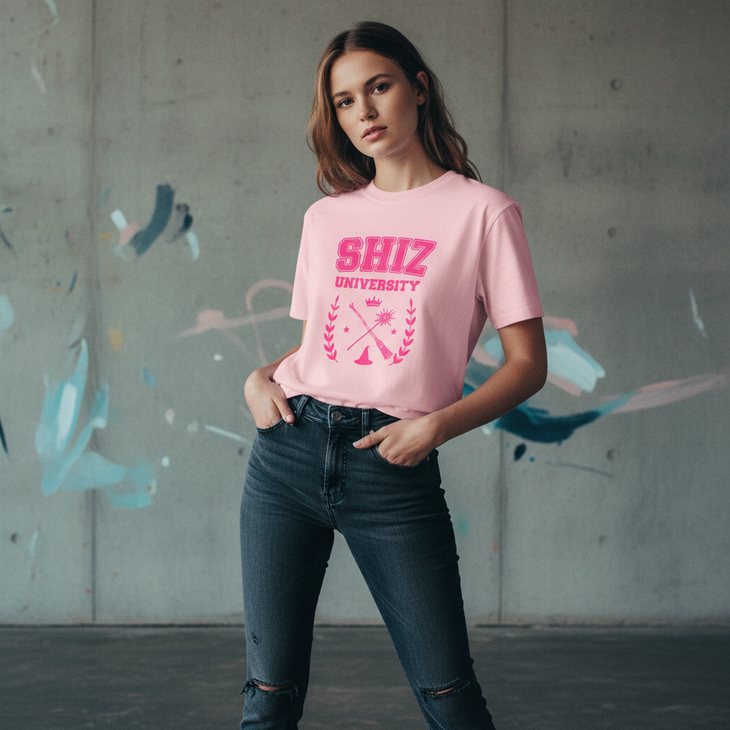 Shiz University t-shirt, wicked apparel, wicked merch, wicked inspired tee, college crest shirt, broom crown wand and hat design, sparkly witchy quote shirt, pink and green aesthetic tee, witchcore apparel, boutique fashion top, pop culture tee, retail ready graphic shirt, comfy cotton tee, magical fandom shirt, sparkly quote tee, witchy aesthetic t-shirt, boutique bestseller, gift for her, gift for him, birthday gift, gift for bestie, stocking stuffer, wicked movie 2 inspired tee, small shop bestseller, trendy boutique apparel, sparkly witchy shirt, pastel and green aesthetic, magical pop culture shirt, cottagecore top, limited edition wicked merch, fandom t-shirt, boutique fashion essential, sparkly retail tee, whimsical Shiz University t-shirt, trending boutique top, magical aesthetic t-shirt