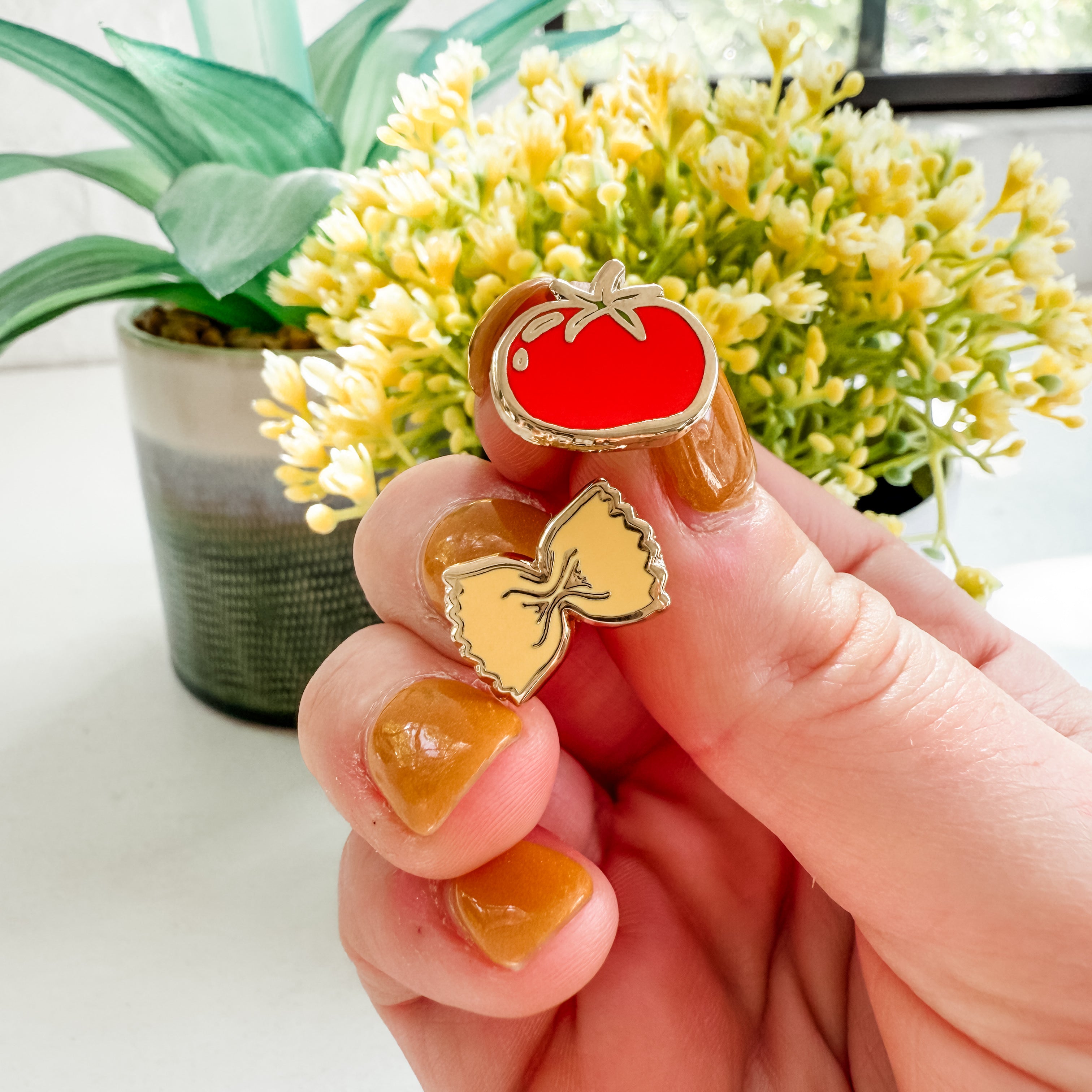 A charming culinary combo, this set includes a happy tomato and a bowtie noodle. Ideal for foodies, fans of tomato girl summer, & European summer themed gifts. A fan favorite for quirky shops and foodie boutiques.