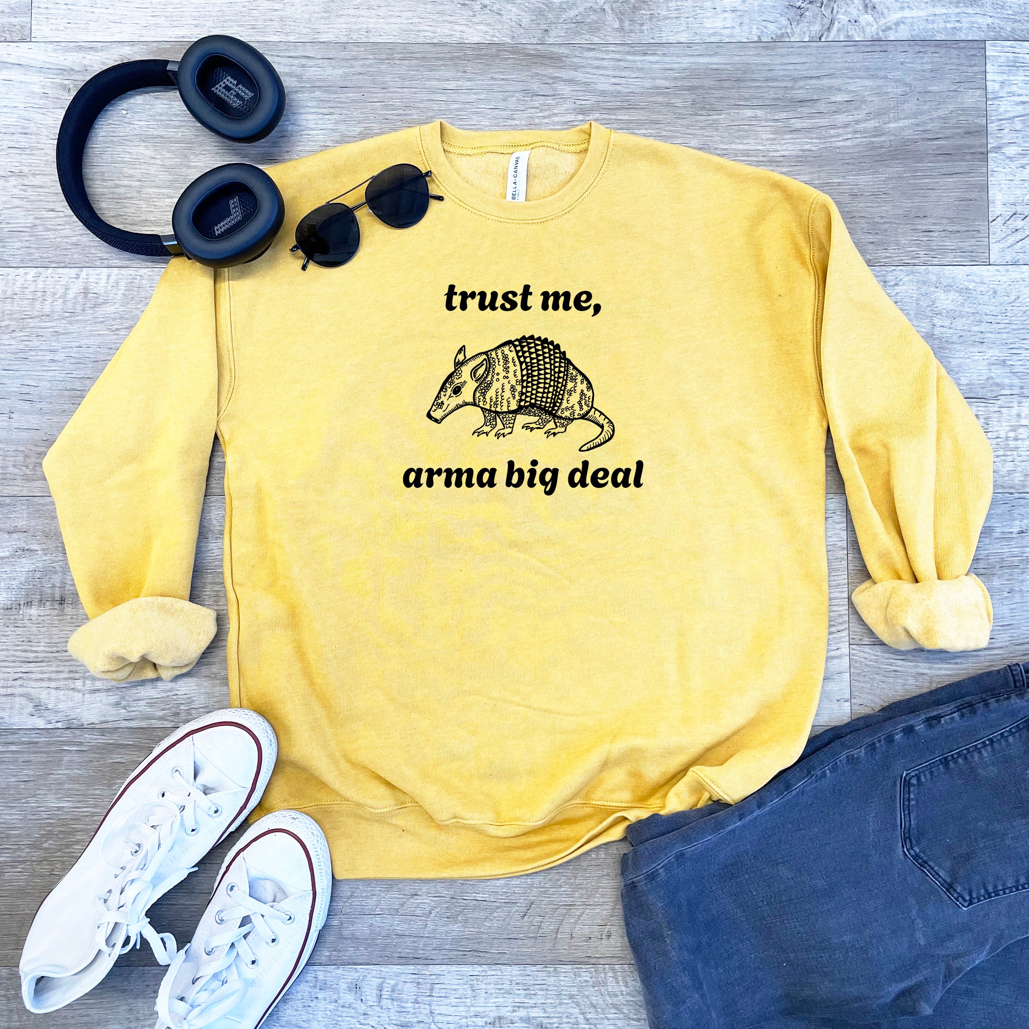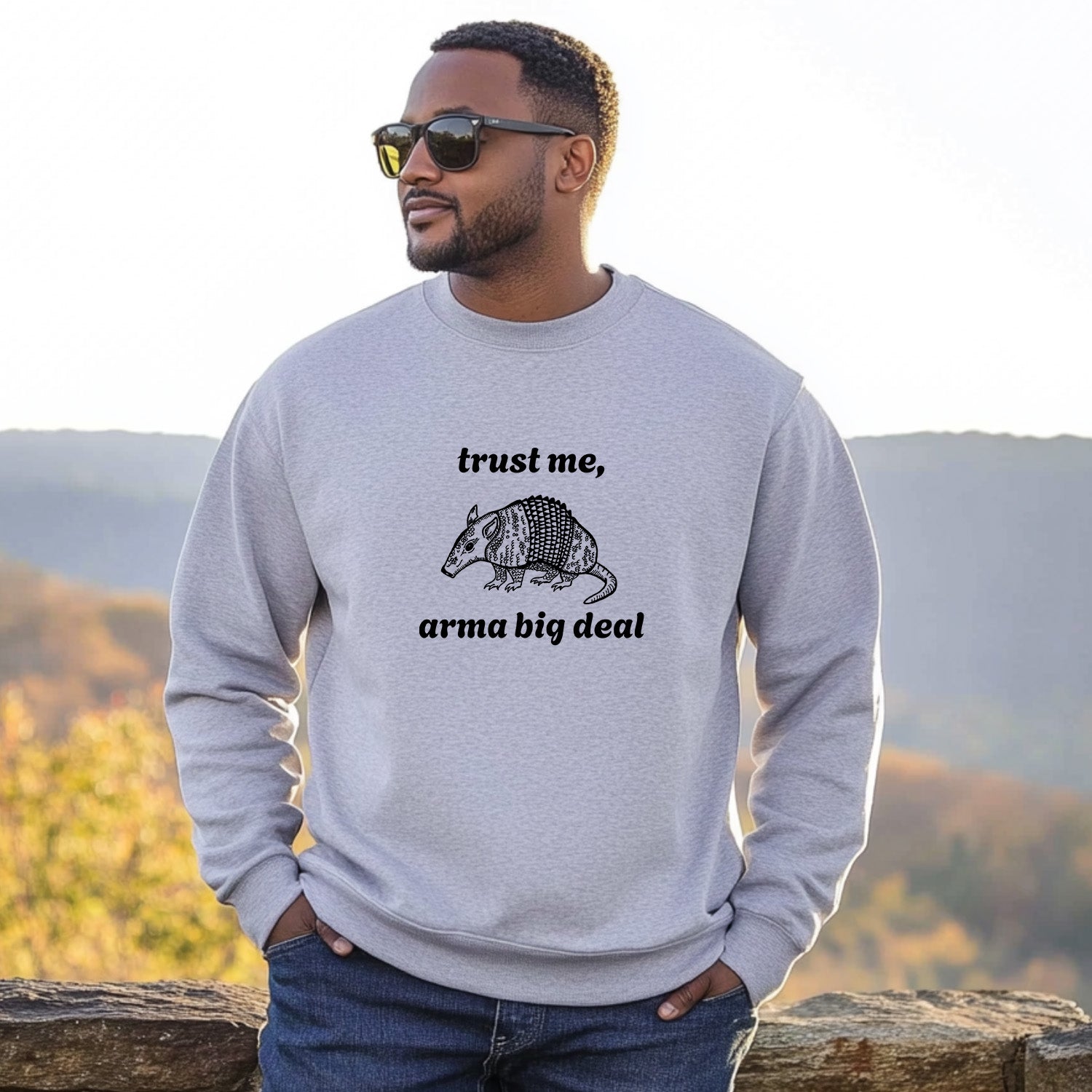Keywords: sweater, pullover, sweatshirt, tshirt, adult, apparel, mens, relax, relaxed, fall, autumn, comfy, casual, unisex, lighthearted, humorous, joke, fun, happy, screenprinted, Arma Big Deal sweatshirt, armadillo graphic hoodie, funny animal pullover, pun sweatshirt, novelty pullover, humor hoodie, quirky graphic sweatshirt, gift for her, gift for him, birthday gift, gift for bestie, stocking stuffer, cotton sweatshirt, cozy pullover, casual hoodie, playful animal pullover, trendy graphic hoodie, pun graphic sweatshirt, farmhouse style, ranch animal hoodie, novelty gift, pop culture hoodie, humorous graphic top, fun animal pun pullover, whimsical animal design, trending animal hoodie, big deal shirt, armadillo shirt, shirts with sayings, shirts with puns, southern apparel, funny southern apparel, southern humor