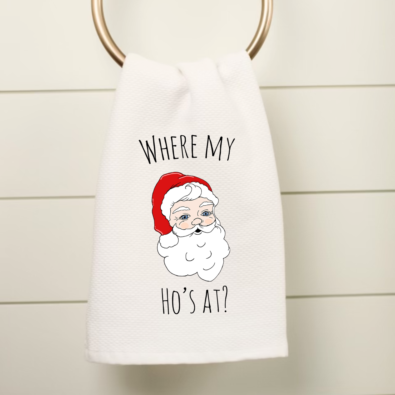 funny christmas hand towel, where my ho’s at santa guest towel, waffle weave holiday bathroom towel, quirky santa humor towel, festive christmas bathroom accessory, boutique holiday linens, santa claus funny hand towel, holiday hostess gift idea, stocking stuffer santa gag gift, farmhouse holiday hand towel, quirky christmas bathroom decor, santa humor novelty towel, holiday party gag gift idea, bold santa christmas towel, funny holiday bathroom accessory, boutique christmas gift item, affordable santa humor holiday gift, trendy christmas humor towel, festive santa hand towel, santa claus holiday novelty decor