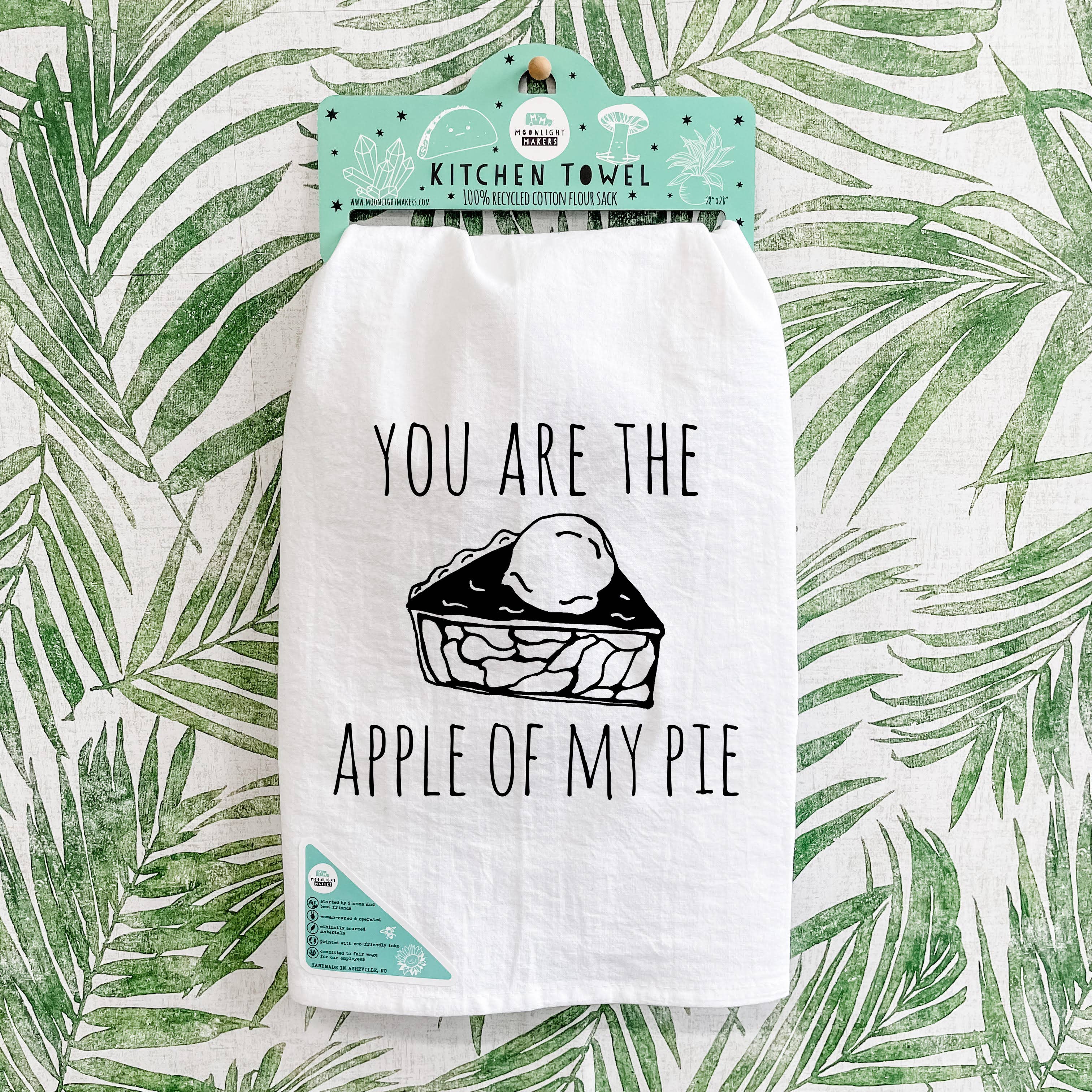 All of our dish towels are 100% cotton flour sack towels. They are screen printed with Moonlight Makers original designs using non-toxic ink.